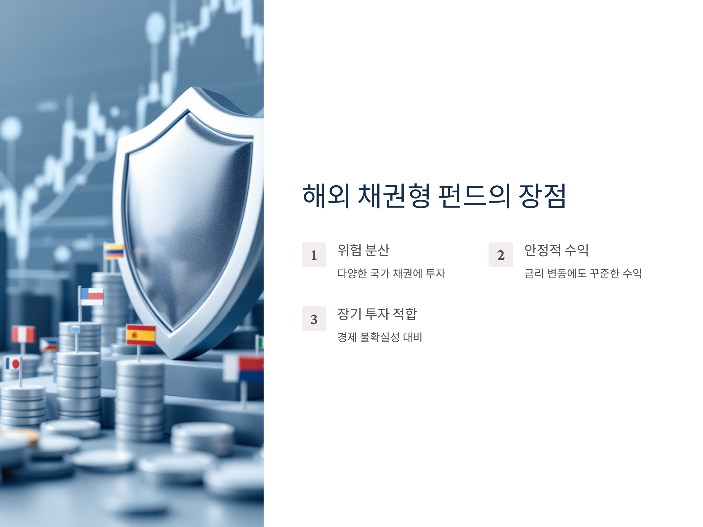해외 채권형 펀드는 다양한 이점을 제공합니다. 가장 큰 장점은 위험 분산입니다. 다양한 국가의 채권에 분산 투자함으로써, 특정 국가의 경제적 충격이나 금리 변동에 따른 리스크를 줄일 수 있습니다. 예를 들어, 미국, 유럽, 아시아 국가의 채권을 포함한 펀드는 한 국가의 경제적 문제로부터 영향을 받지 않기 때문에 더 안정적인 수익을 기대할 수 있습니다.