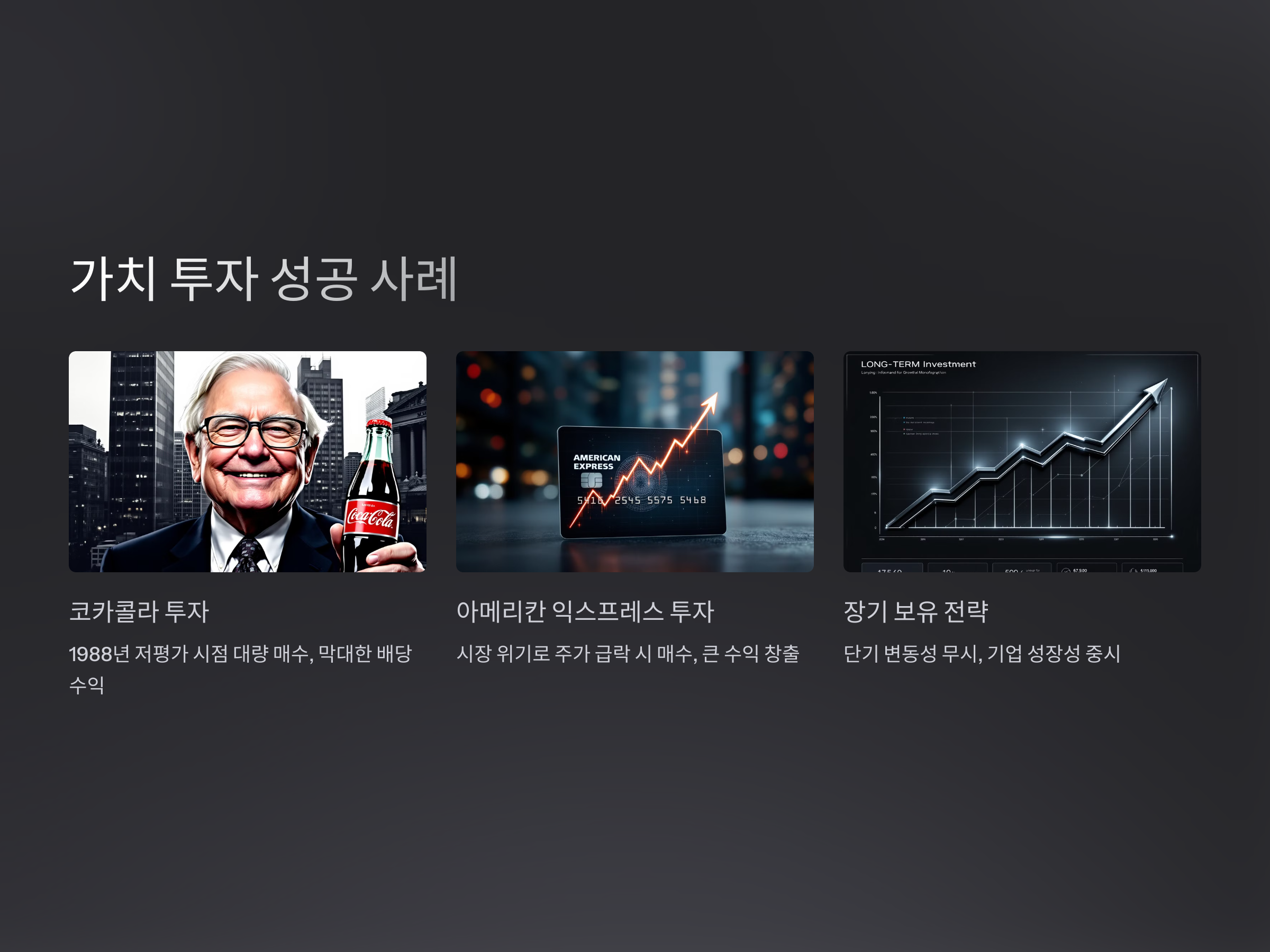 - 코카콜라 투자: 버핏은 1988년 코카콜라의 저평가된 시점에 대량 매수하여 현재까지 보유 중이며, 막대한 배당 수익을 얻고 있음.