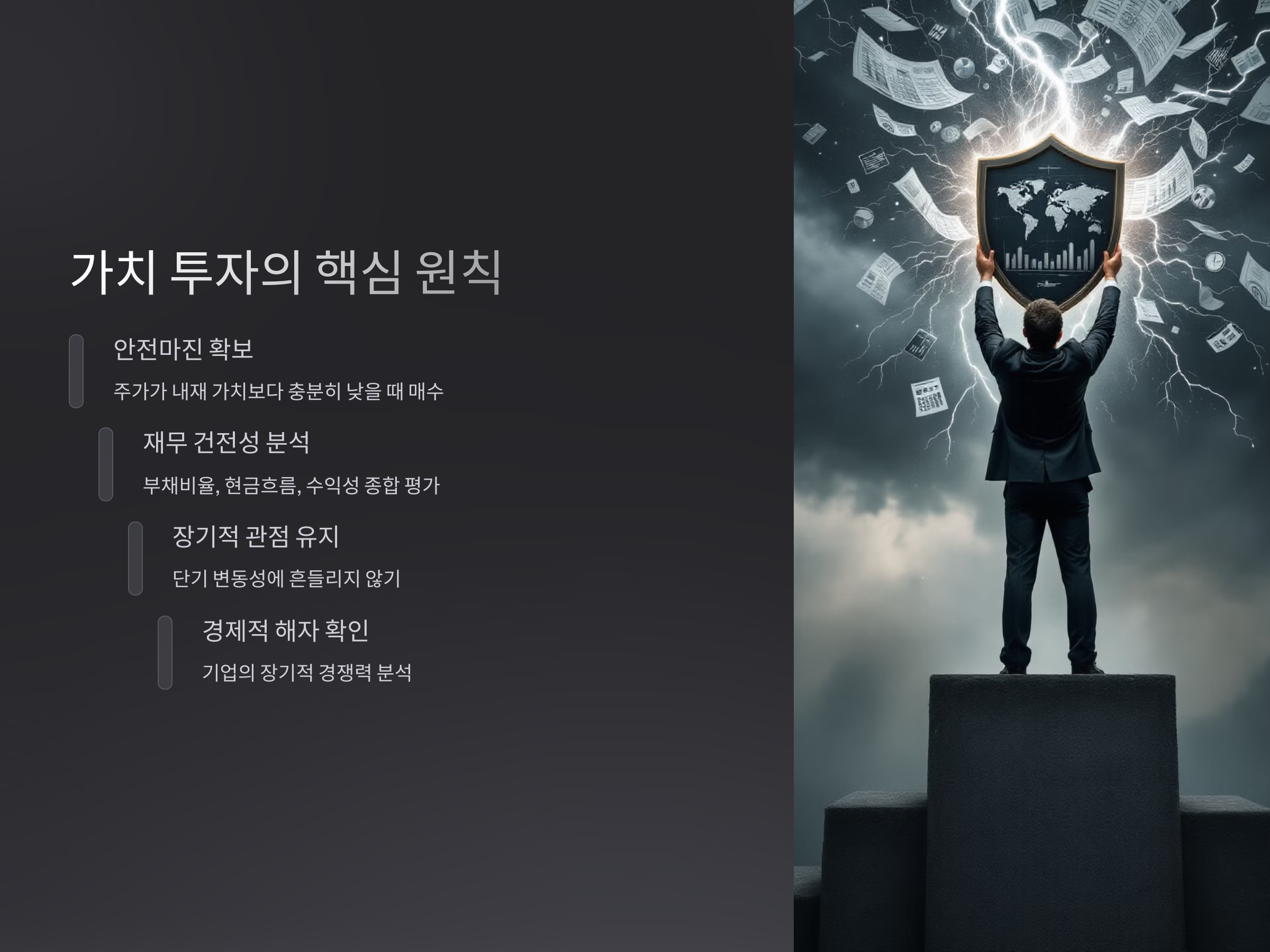 가치 투자에서는 몇 가지 핵심 원칙을 따르는 것이 중요합니다. 이 원칙들은 가치 투자자들이 안정적으로 수익을 올릴 수 있도록 돕는 역할을 합니다.