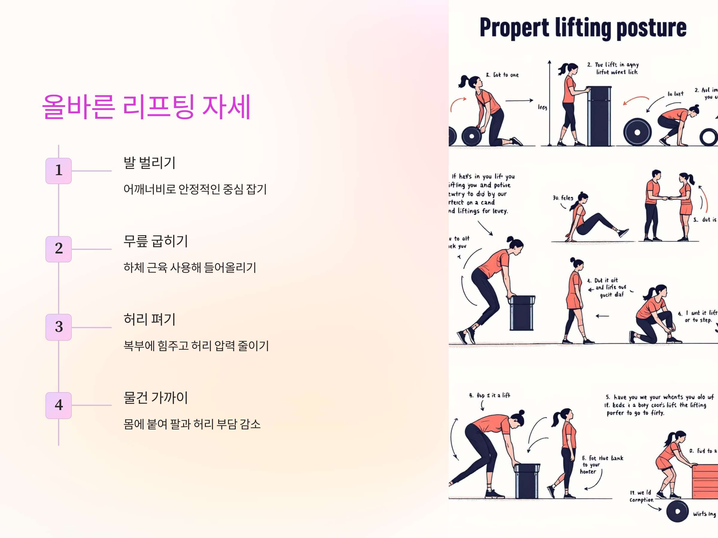 올바른 리프팅은 허리 건강을 지키는 데 필수적입니다. 이 글에서 소개한 방법과 원칙을 일상생활에 적용하여 부상의 위험을 줄이고 건강한 삶을 유지하세요.