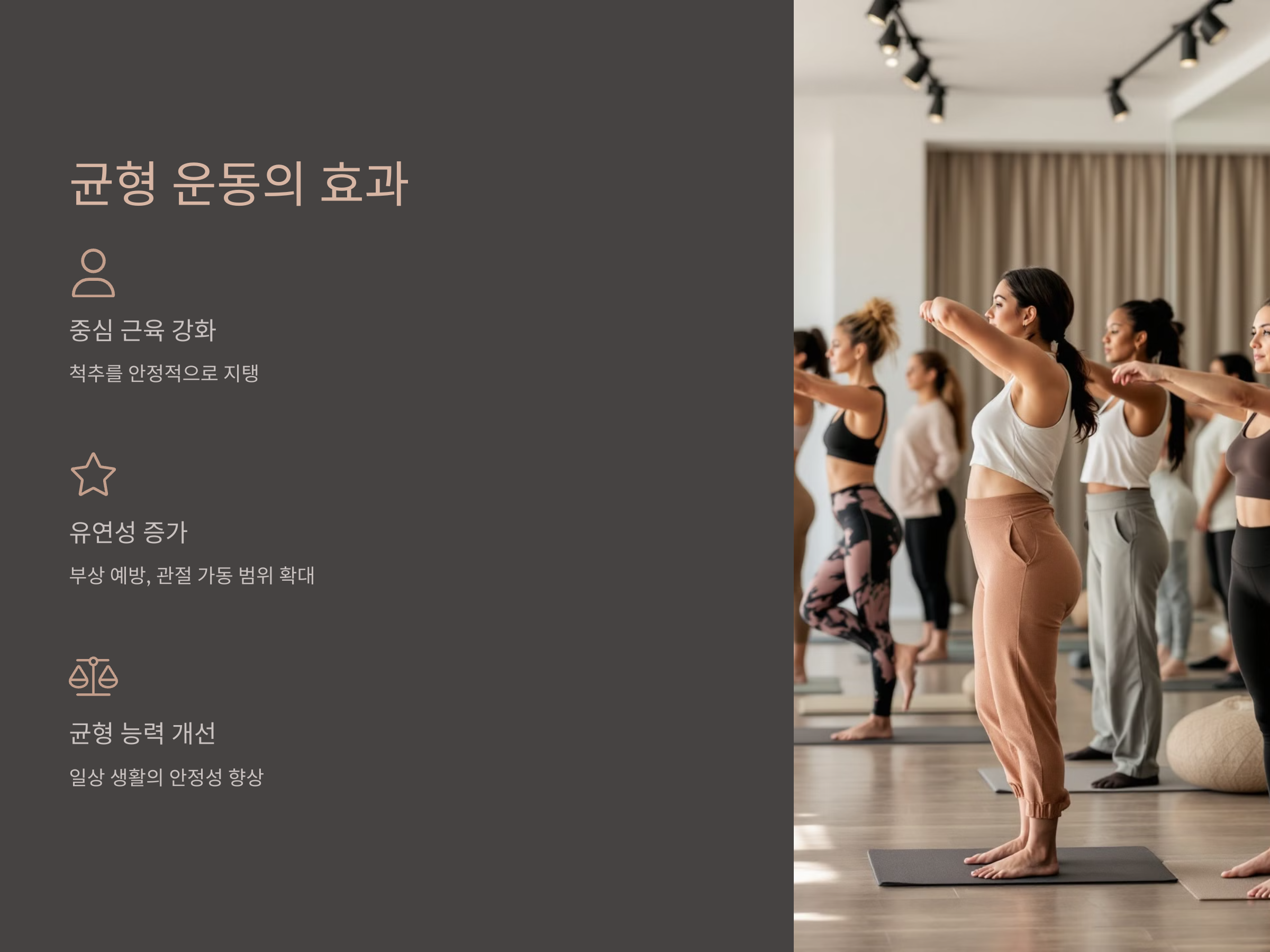 균형 운동은 단순히 몸을 움직이는 것을 넘어, 몸의 안정성을 높이고 근육 협응을 향상시킵니다. 특히 허리 건강에 다음과 같은 긍정적인 효과를 줍니다.