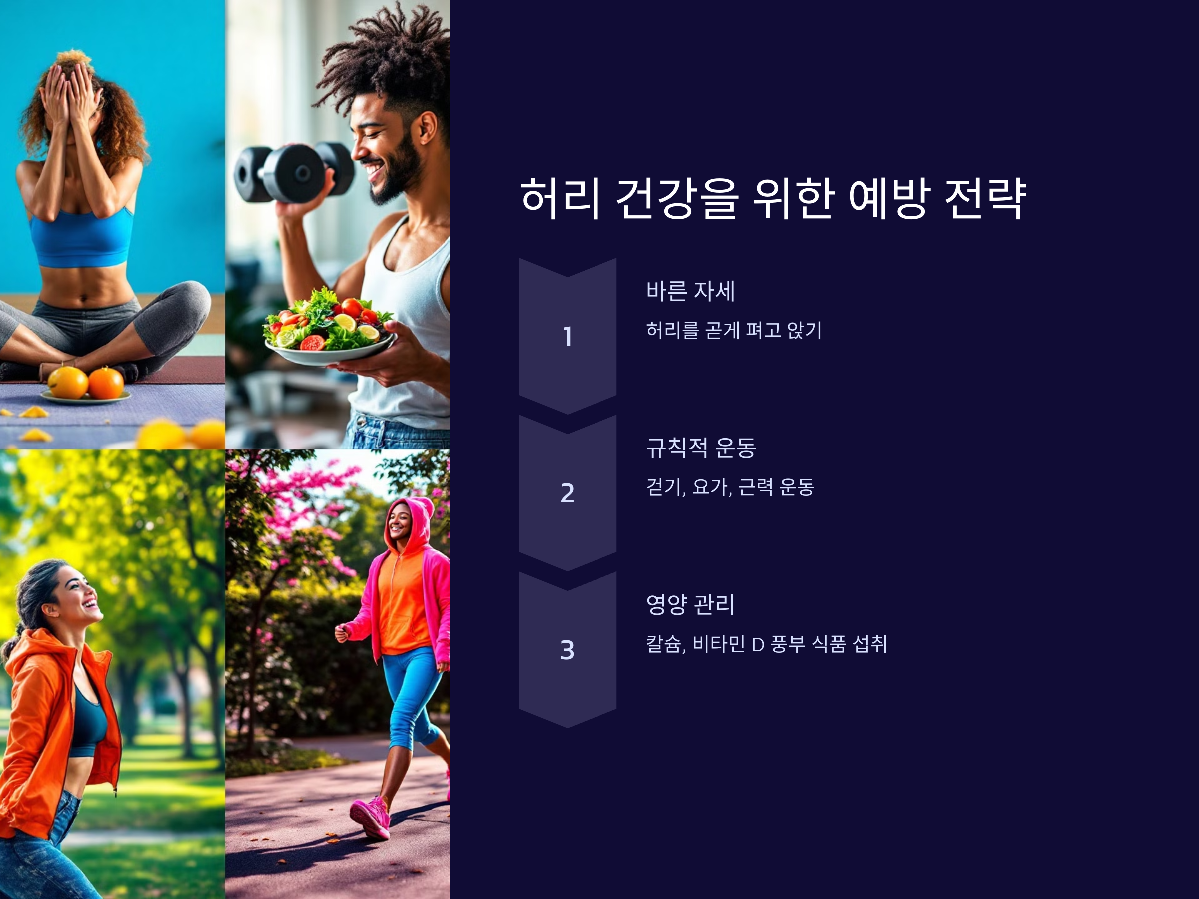 허리 건강은 적절한 영양 섭취와도 밀접한 관련이 있습니다. 다음과 같은 영양소를 충분히 섭취하도록 하세요: