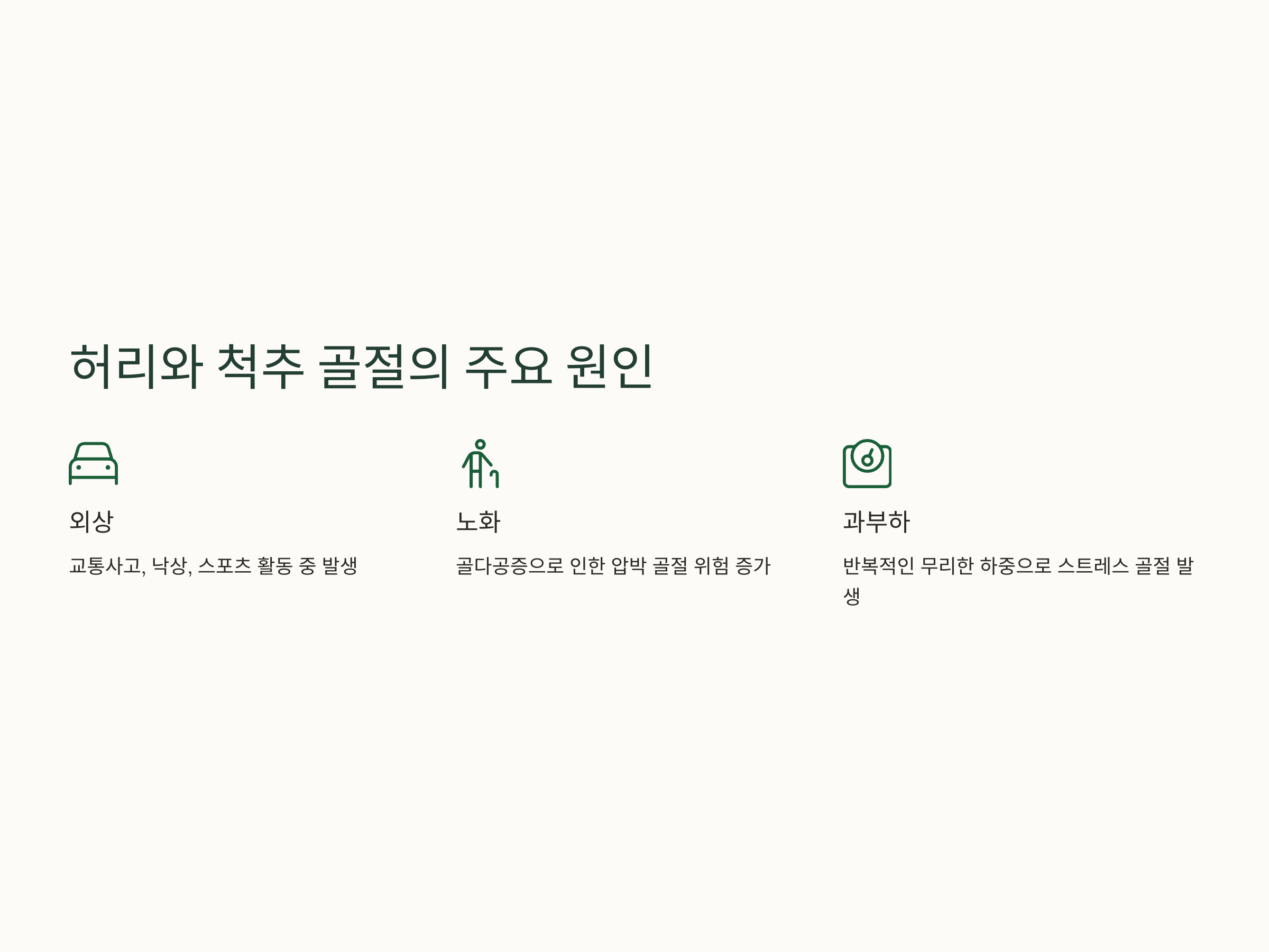 교통사고, 낙상, 스포츠 활동 중 발생하는 외상은 척추 골절의 주요 원인 중 하나입니다. 특히 중년 이상에서 골밀도가 낮아지면서 외상에 취약해집니다.