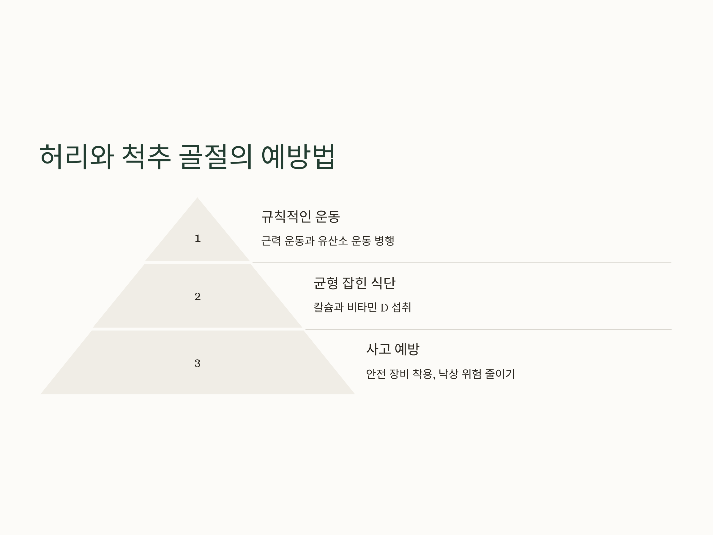 칼슘과 비타민 D를 충분히 섭취하여 뼈 건강을 유지하세요. 유제품, 생선, 채소 등이 골밀도를 높이는 데 도움이 됩니다.