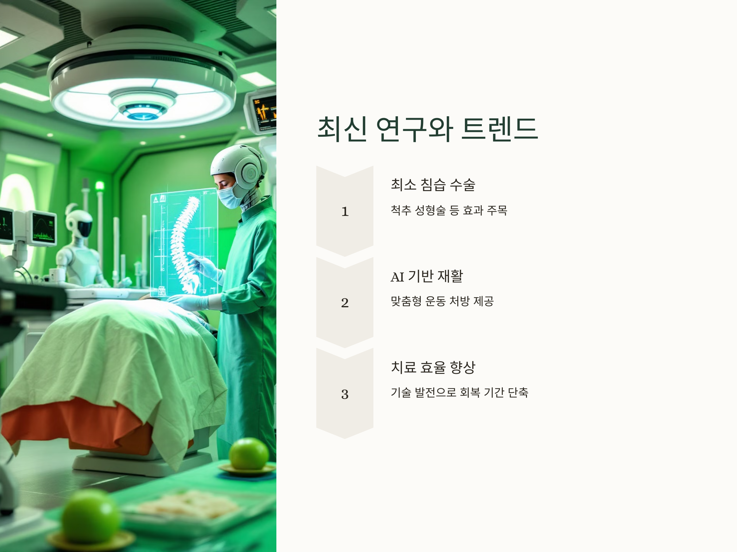최근 의료 기술 발전으로 척추 성형술과 같은 최소 침습 수술의 효과가 주목받고 있습니다. 또한, AI 기반 재활 프로그램이 척추 환자에게 맞춤형 운동 처방을 제공하며 치료 효율을 높이고 있습니다.