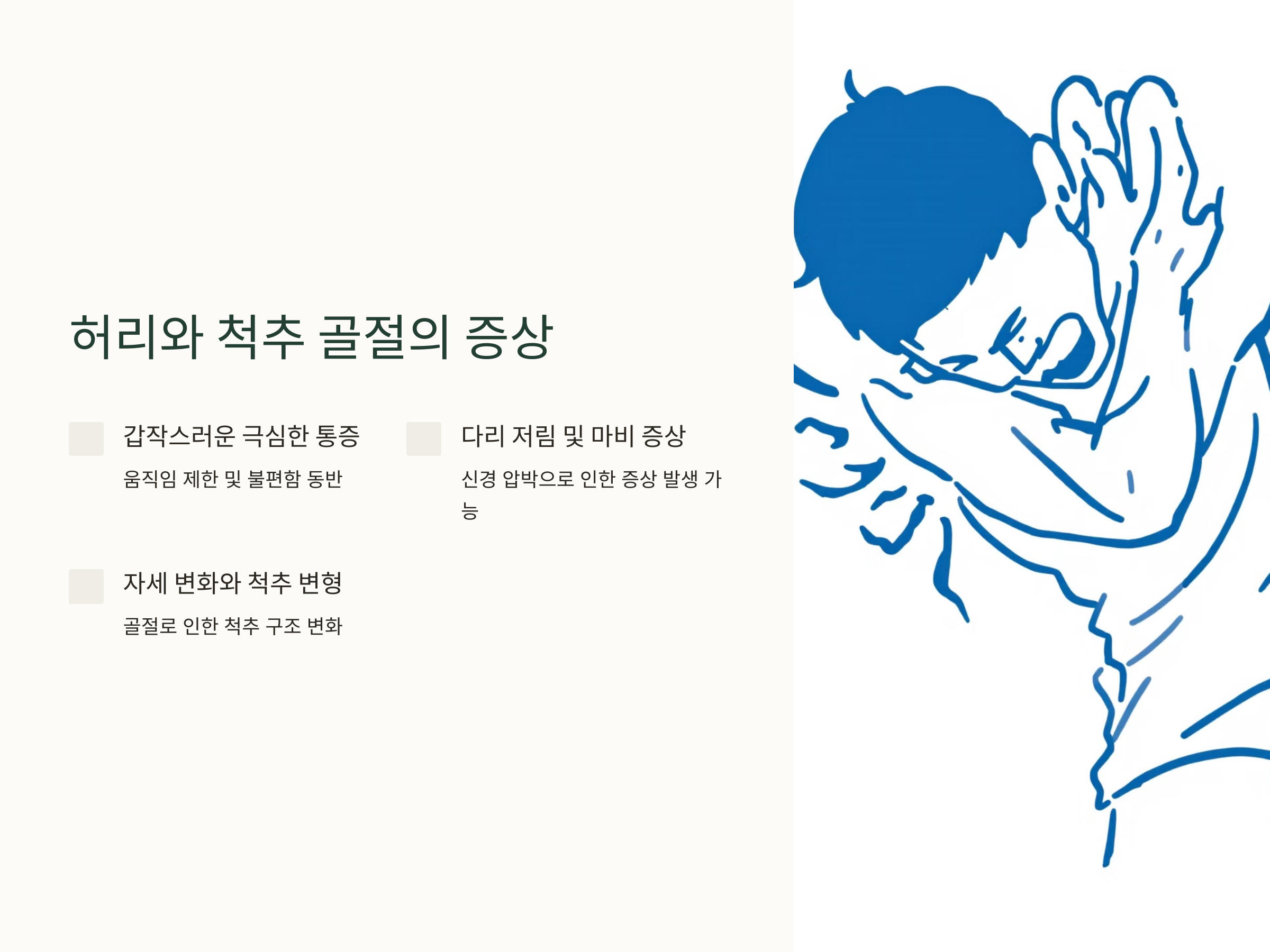 골절 후유증은 척추의 불안정성, 지속적인 통증, 운동 제한 등 다양하게 나타날 수 있습니다. 재활 치료와 함께 심리적인 지원도 필요하며, 장기적인 계획 아래 꾸준한 관리를 통해 극복 가능합니다.