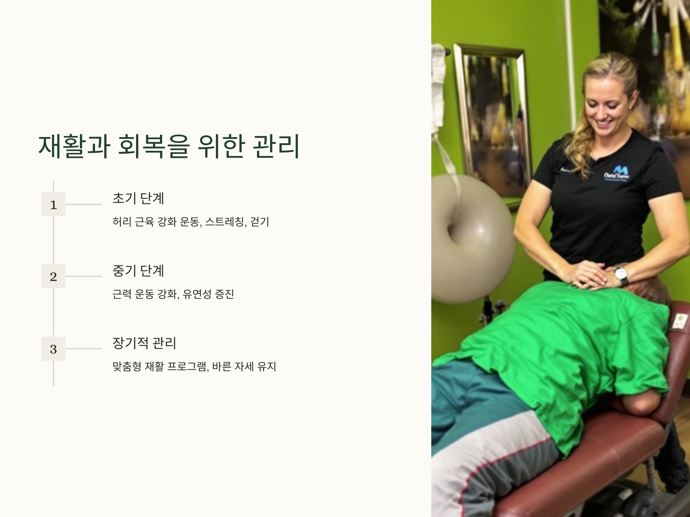 재활 초기에는 허리 근육 강화 운동과 스트레칭을 통해 유연성을 회복하고, 통증을 완화해야 합니다. 걷기 운동과 같은 가벼운 신체 활동부터 시작합니다.