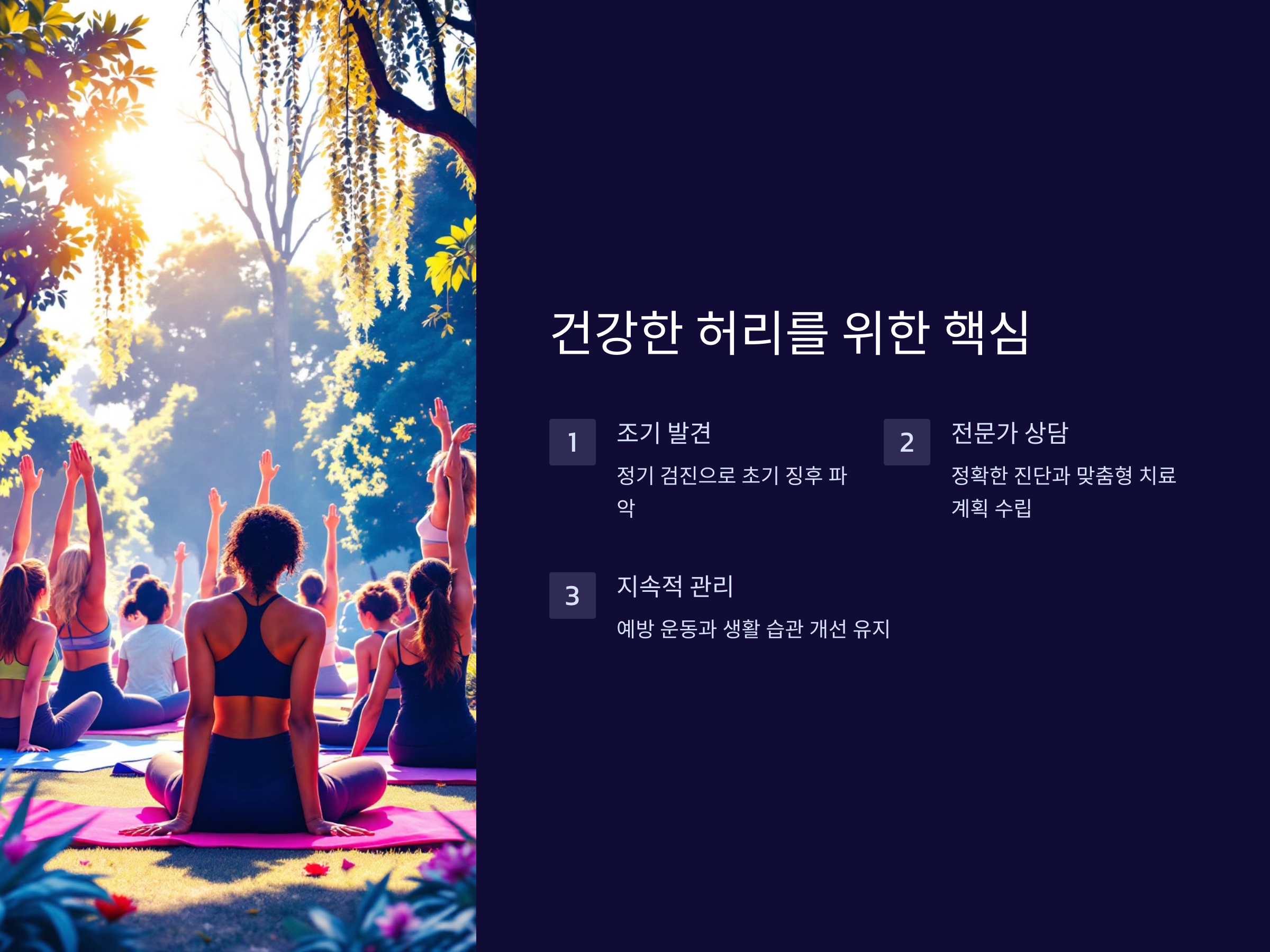 - 증상이 없더라도 정기적인 운동과 생활 습관 개선으로 척추 건강을 유지하는 것이 중요합니다.