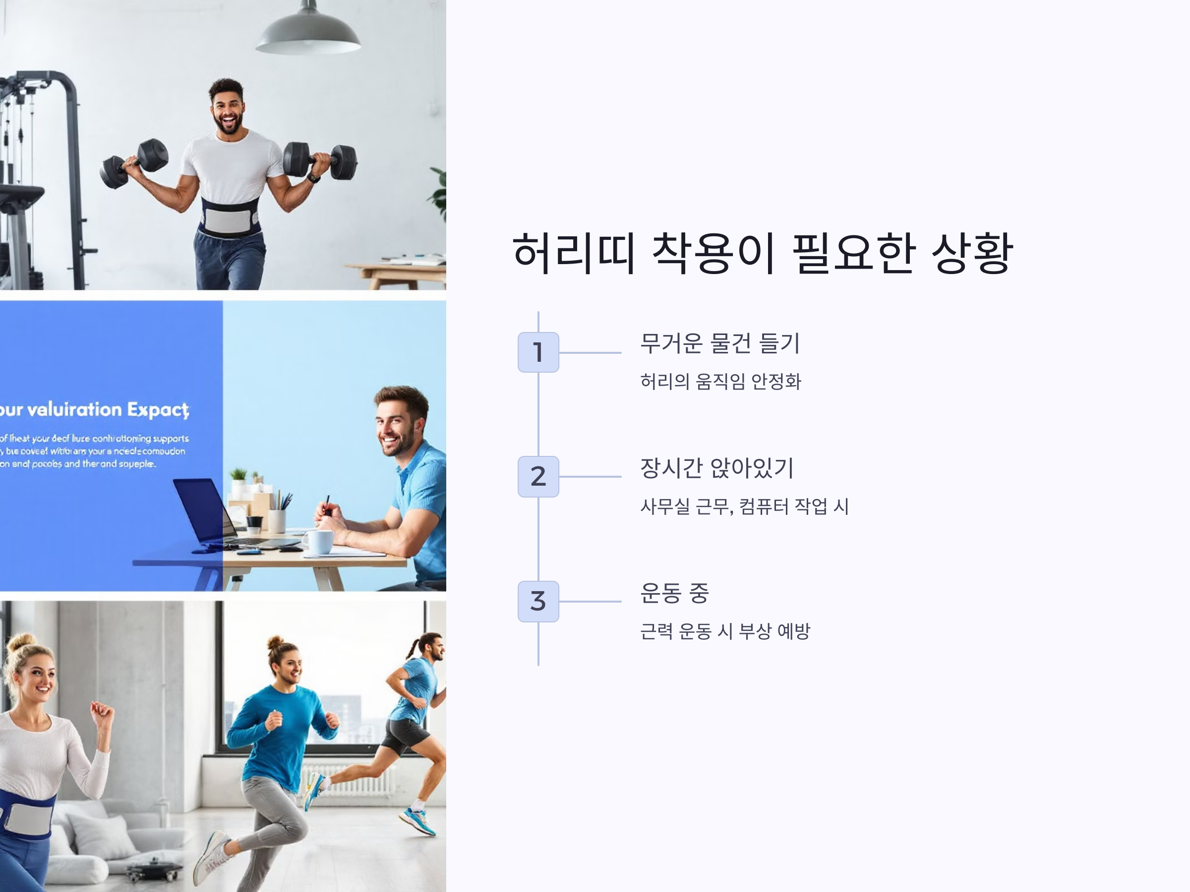 무거운 물건을 들 때, 장시간 앉아 있을 때, 또는 운동 중에 착용하면 허리 부담을 줄여주는 효과가 있습니다.