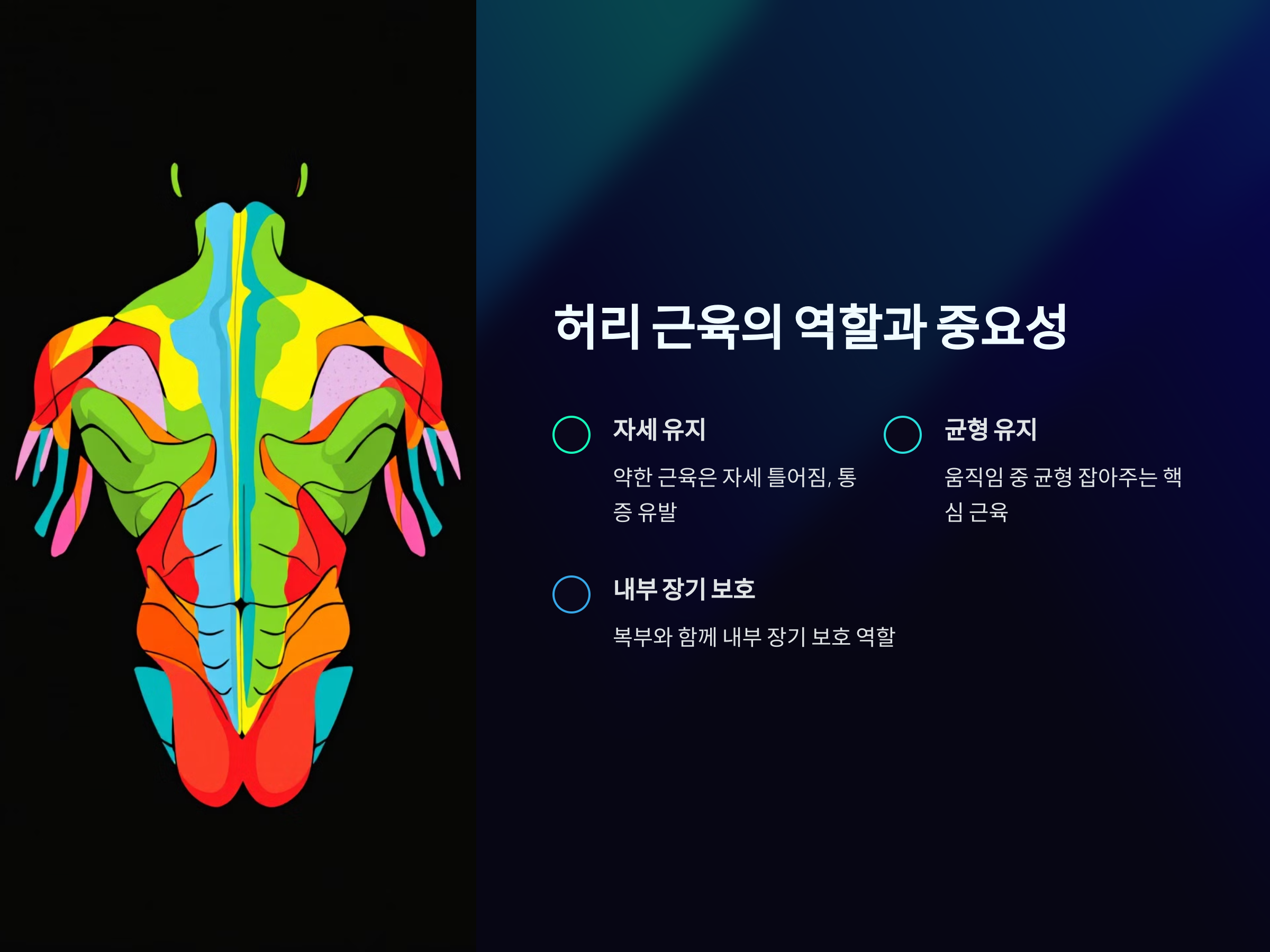 - 내부 장기 보호: 허리 근육은 복부와 함께 내부 장기를 보호하는 역할을 합니다.