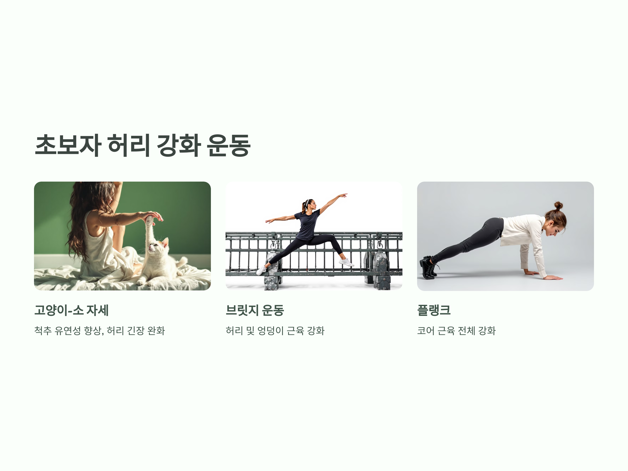 운동 경험이 적거나 처음 시도하는 분들에게 적합한 루틴입니다. 가벼운 스트레칭과 기본 코어 운동으로 시작해 허리 근육을 안정적으로 강화할 수 있습니다.