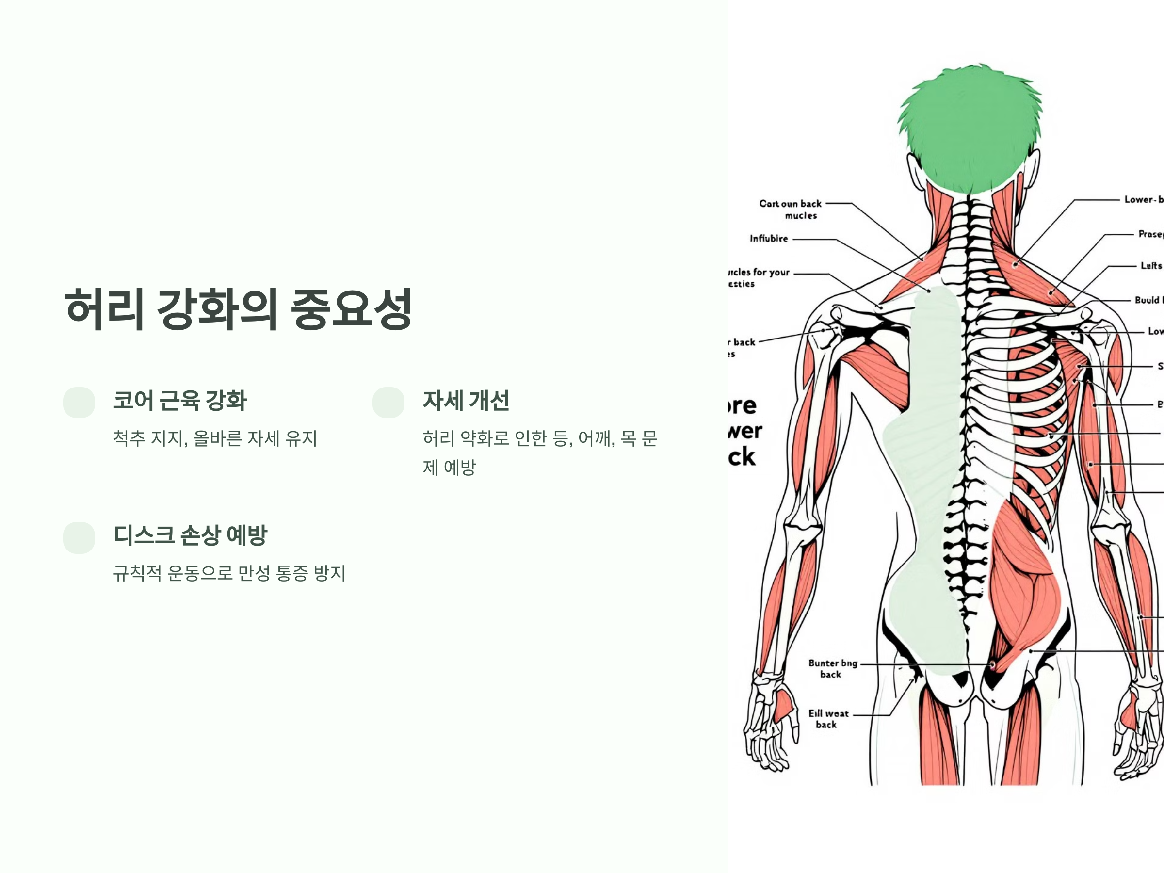 - 코어 근육의 역할: 복부, 등, 골반 주변 근육은 척추를 지지하고 올바른 자세를 유지합니다.