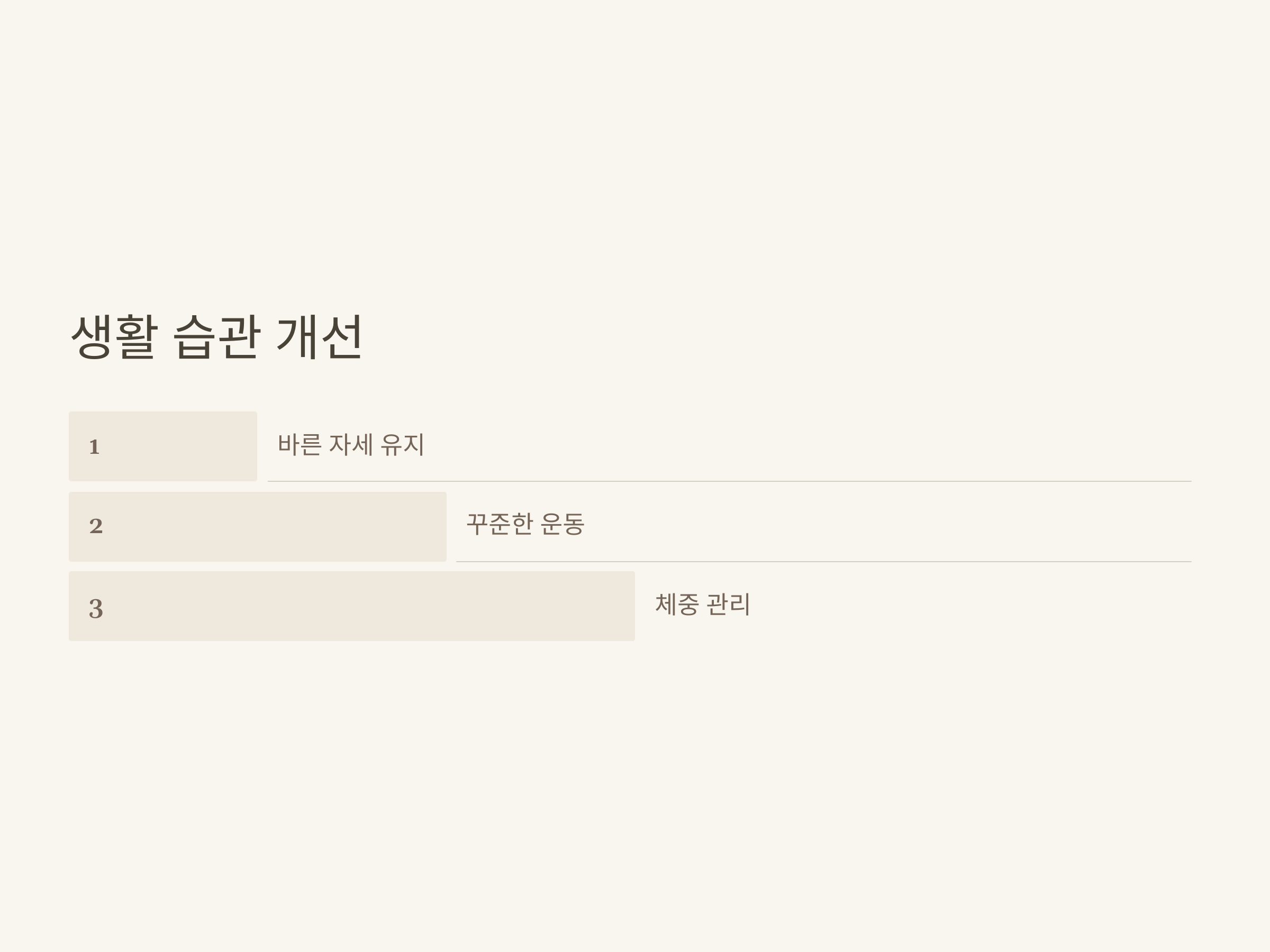 허리 강화 운동 외에도 평소 생활 습관을 개선하는 것이 중요합니다. 올바른 자세와 생활 습관을 유지하는 것만으로도 허리 건강을 지킬 수 있습니다.