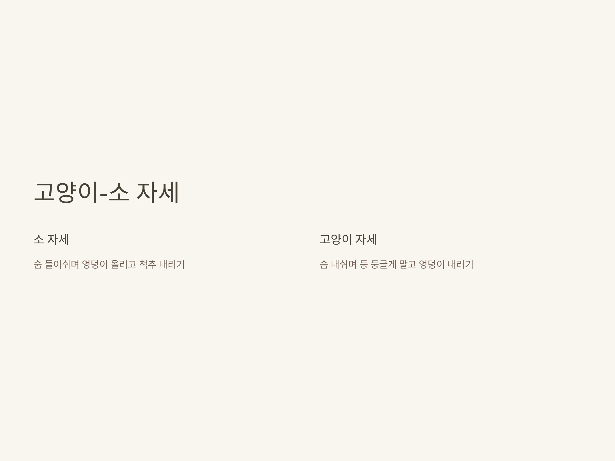 - 숨을 내쉬며 등을 둥글게 말고 엉덩이를 아래로 내립니다(고양이 자세).