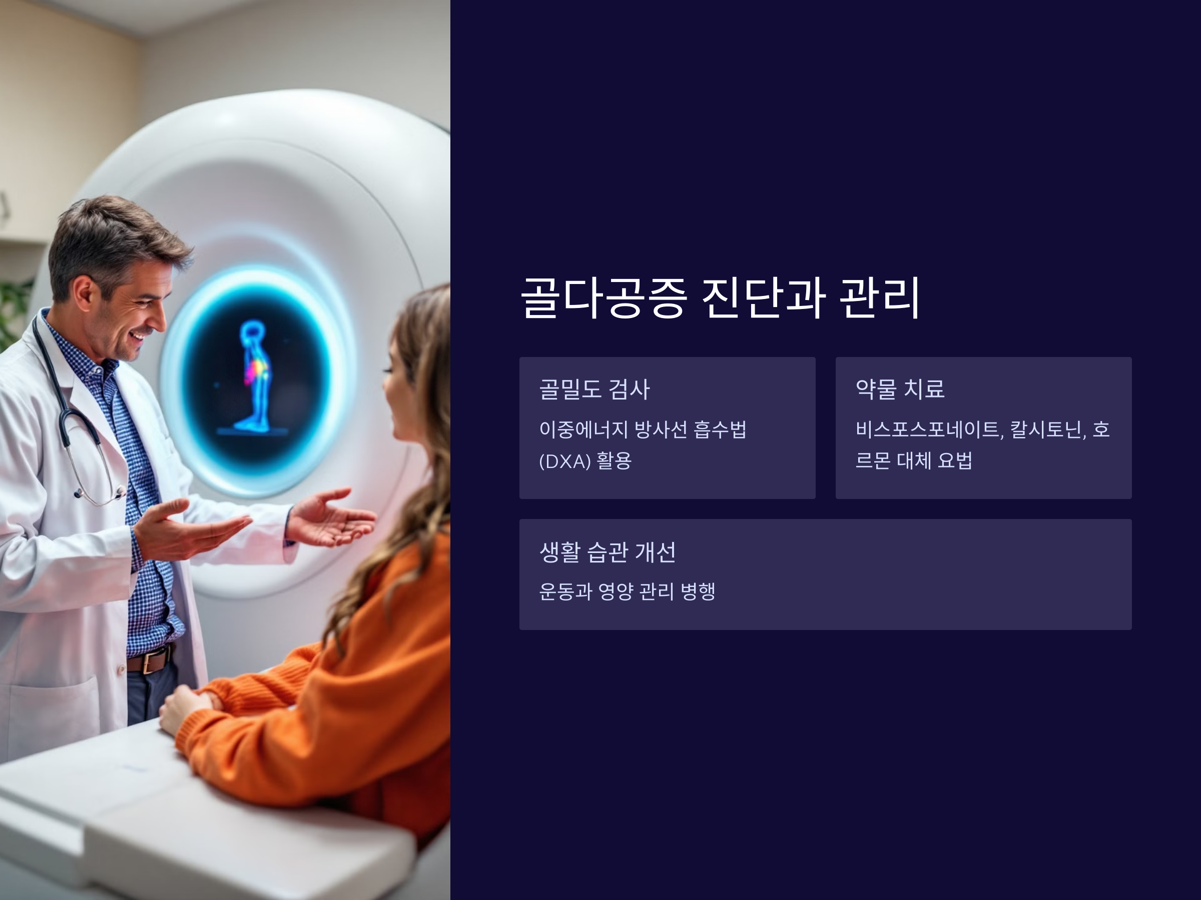 골다공증은 조기에 진단하고 적절히 관리하는 것이 중요합니다. 골밀도 검사는 가장 신뢰할 수 있는 진단 방법으로, 특히 폐경 이후 여성에게 권장됩니다.