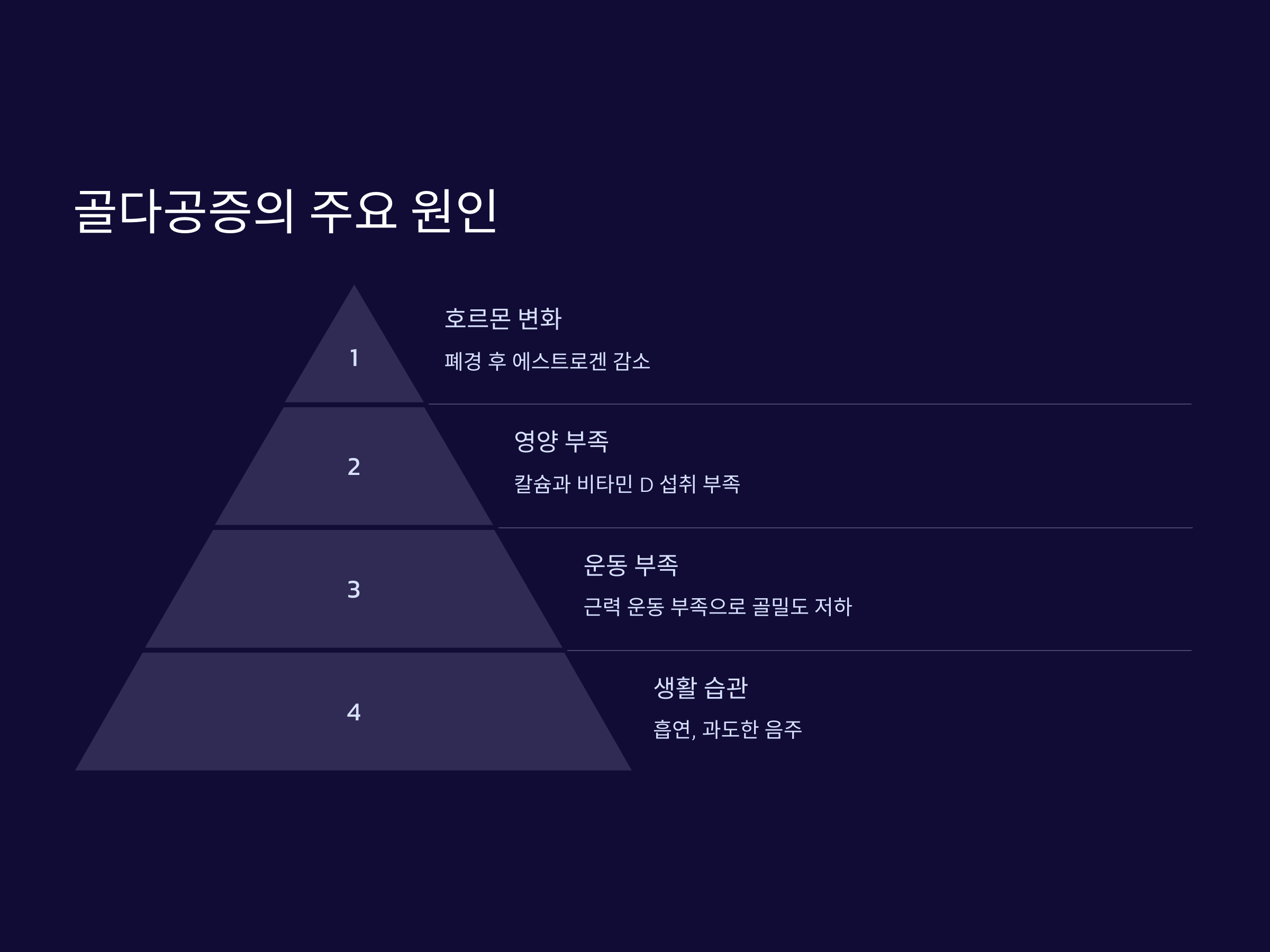 - 호르몬 변화: 폐경 후 여성은 에스트로겐 감소로 인해 골밀도가 급격히 낮아집니다.