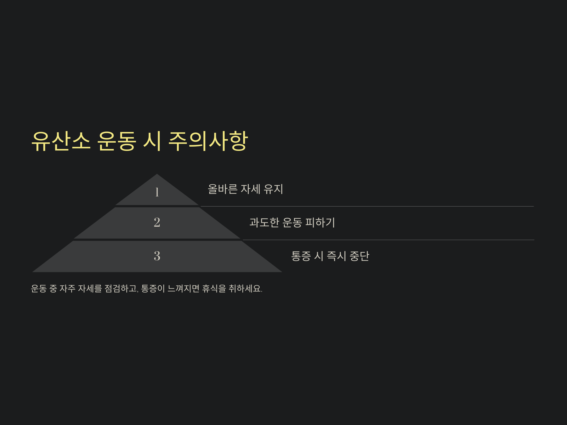 유산소 운동을 할 때는 항상 올바른 자세를 유지하는 것이 중요합니다. 예를 들어, 걷기나 자전거를 탈 때 허리를 똑바로 펴고, 어깨와 엉덩이가 일직선이 되도록 합니다. 잘못된 자세는 허리 통증을 유발할 수 있기 때문에 운동 중에도 자주 자세를 점검하는 것이 좋습니다.