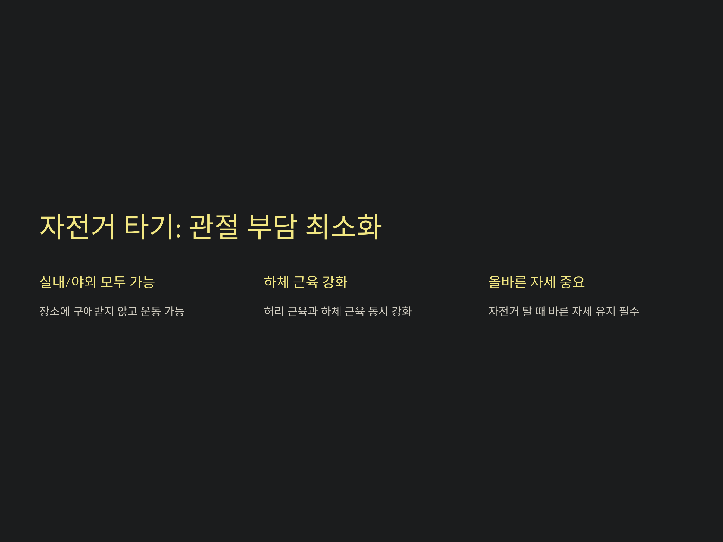 자전거 타기는 관절에 부담을 최소화하면서 유산소 운동 효과를 높일 수 있는 좋은 방법입니다. 실내 자전거나 야외 자전거 모두 허리 근육을 강화하는 데 도움이 됩니다. 특히, 자전거 타기는 하체 근육을 강화하는 데 좋으며, 허리 근육도 함께 단련됩니다. 자전거를 탈 때 올바른 자세를 유지하는 것이 중요하므로, 자세에 신경을 써야 합니다.