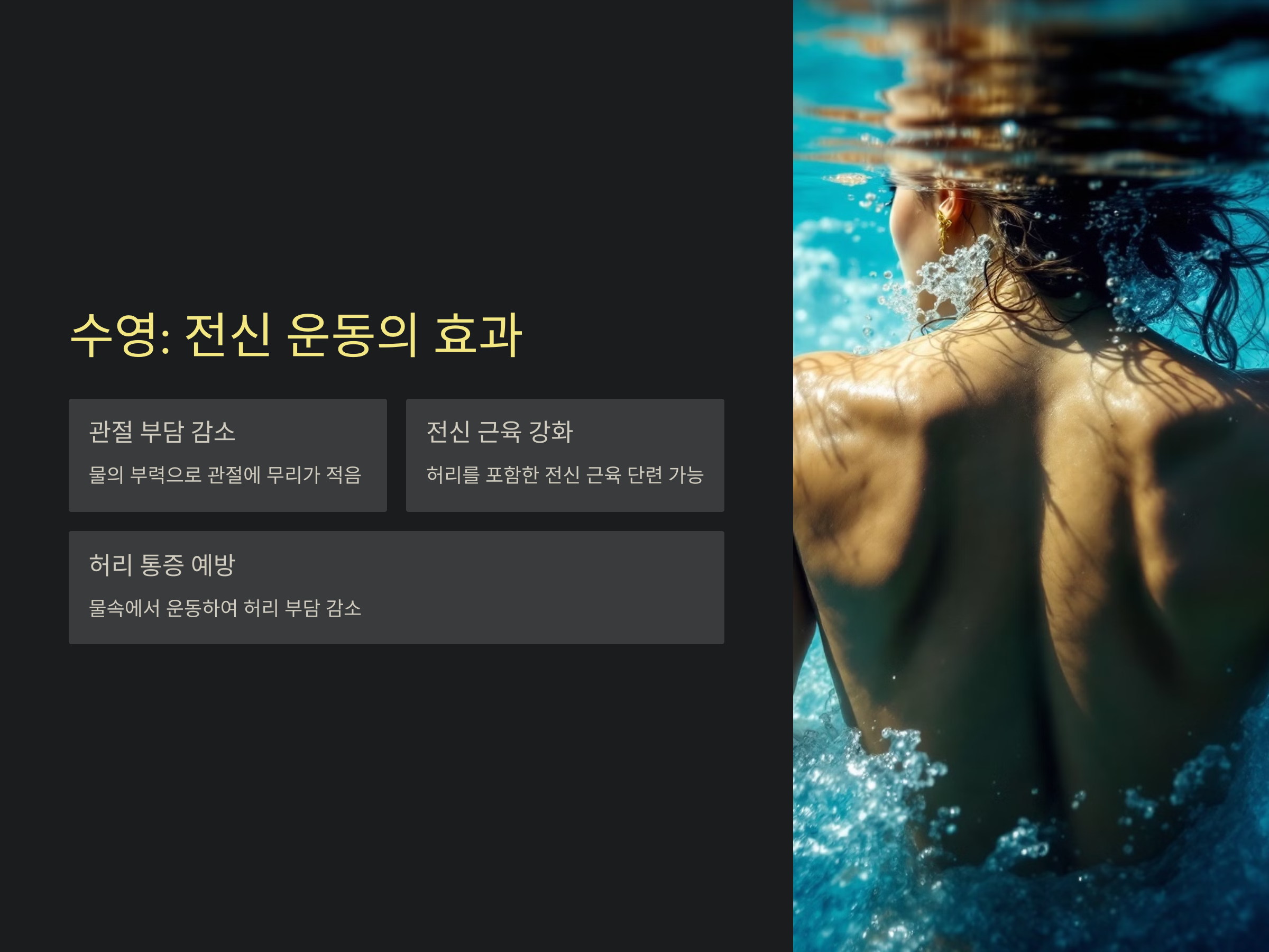 수영은 물에서 운동을 하기 때문에 관절에 부담이 적고, 전신을 고루 강화할 수 있는 유산소 운동입니다. 특히 수영은 허리 근육을 강화하는 데 매우 효과적입니다. 물의 부력 덕분에 허리에 부담을 줄일 수 있어 허리 통증을 예방하는 데 좋습니다.