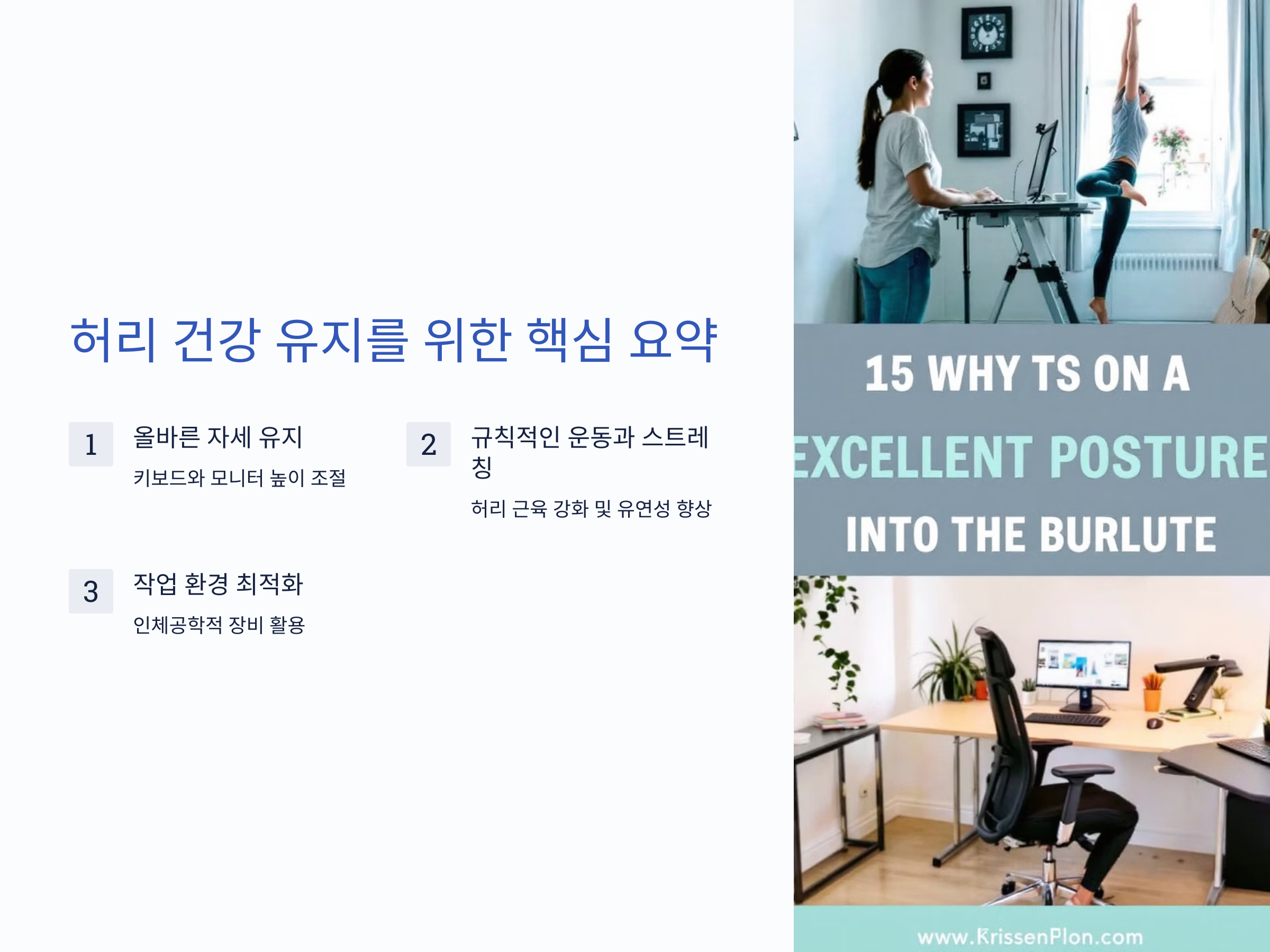 - 작업 환경을 정기적으로 점검하여 올바른 자세를 유지할 수 있는지 확인.