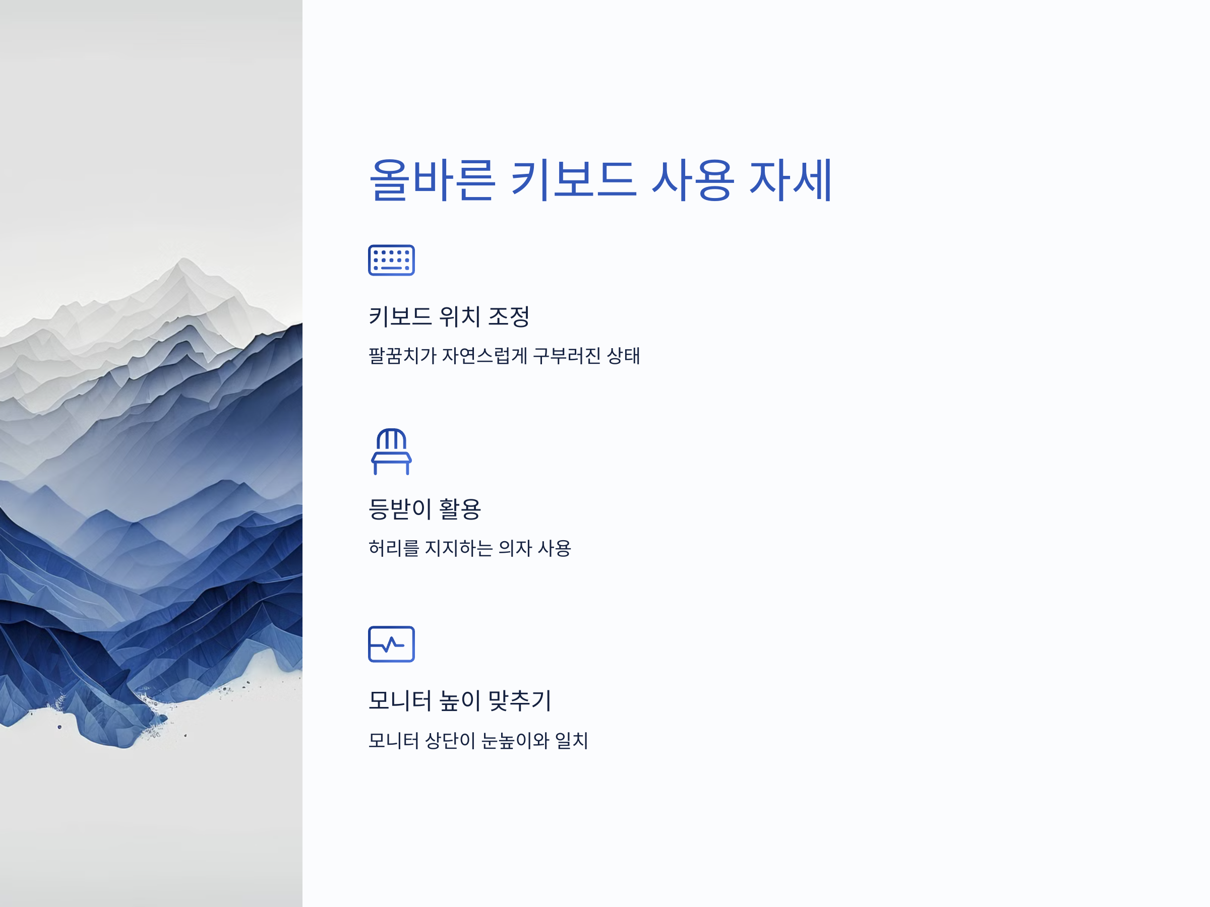 허리 건강을 유지하려면 키보드를 사용할 때 다음 원칙을 지키는 것이 중요합니다: