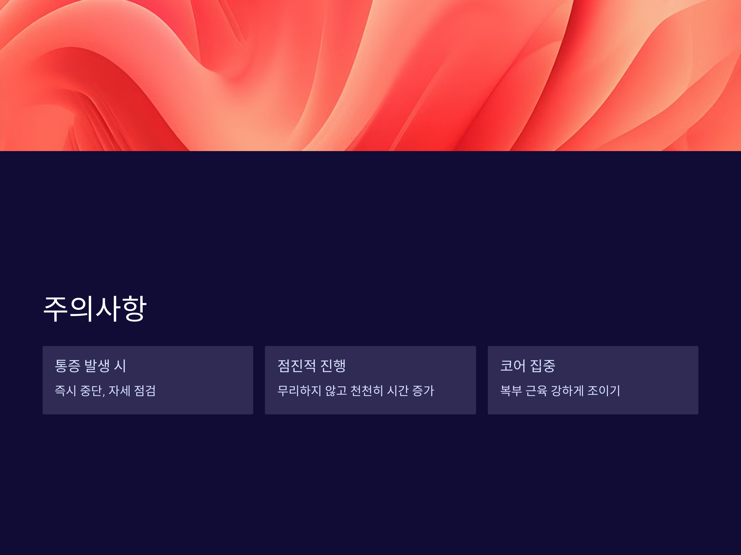 - 허리나 목에 통증이 발생하면 즉시 운동을 중단하고 자세를 점검해야 합니다.