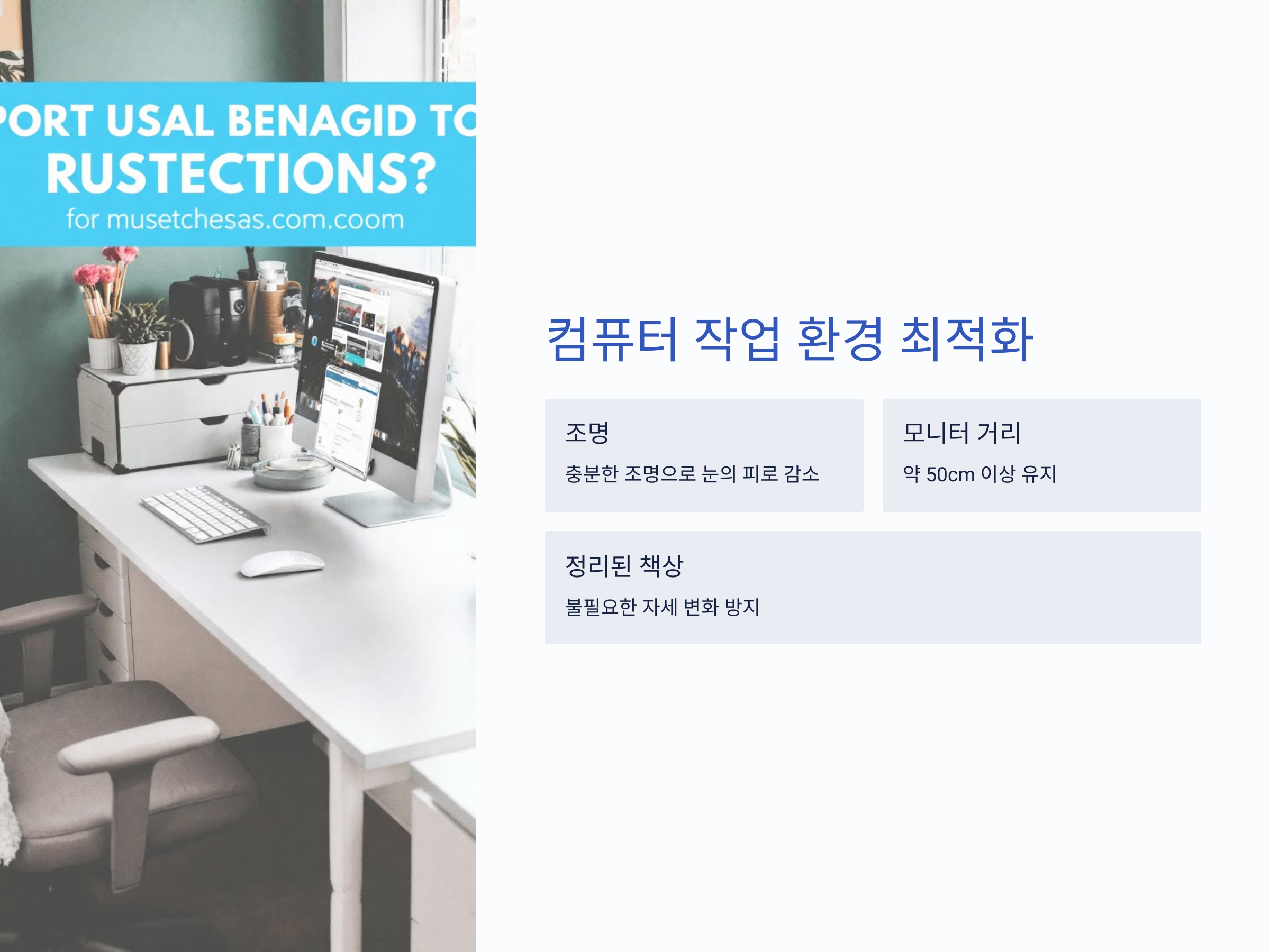 컴퓨터 책상은 적절한 높이와 거리를 유지해야 합니다. 키보드는 팔꿈치 각도가 90도 정도가 되게 배치하고, 모니터는 눈높이에 맞춥니다.