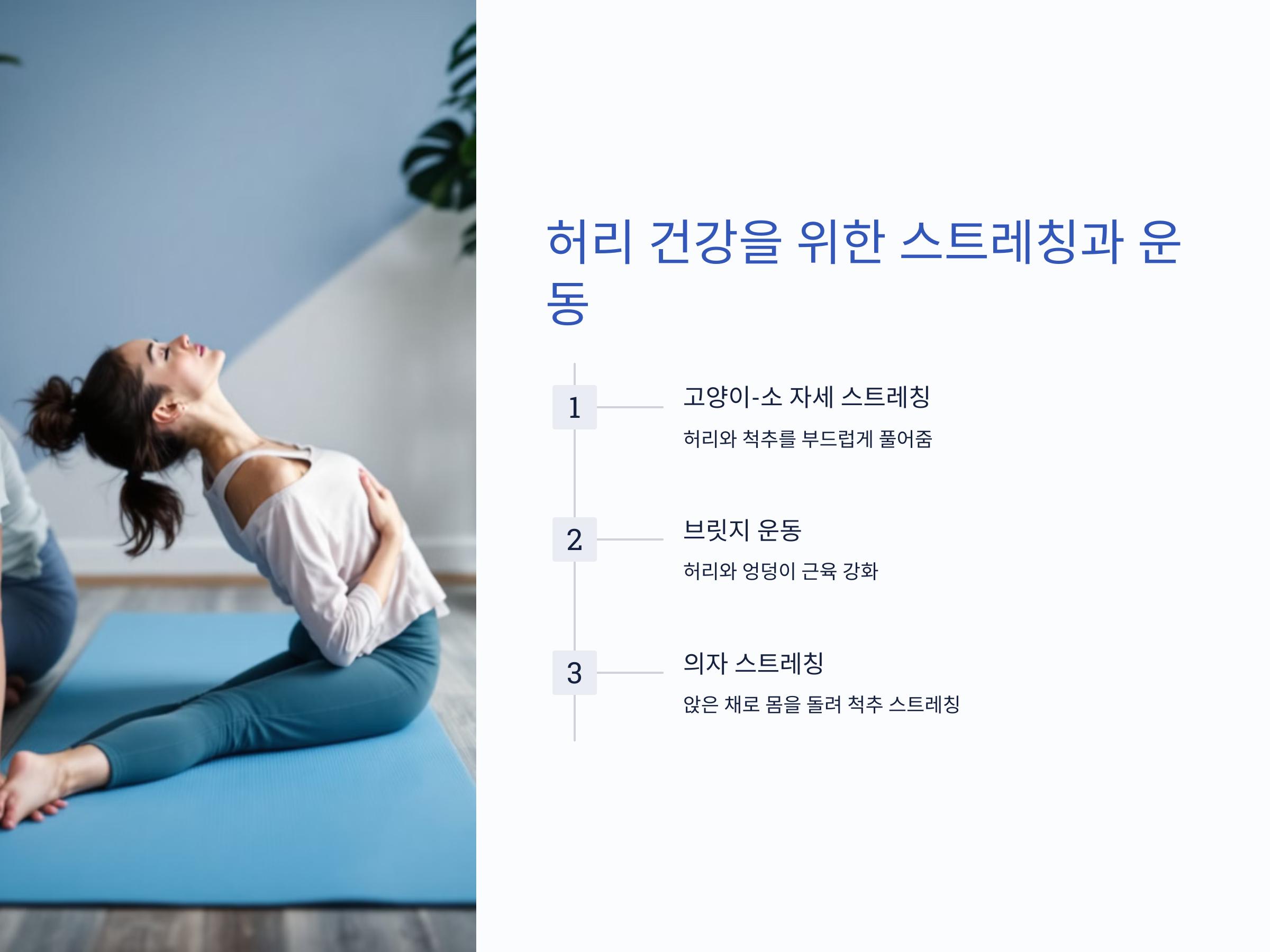 허리 스트레칭은 간단하지만 강력한 효과를 줍니다. 아래 동작들을 추천합니다: