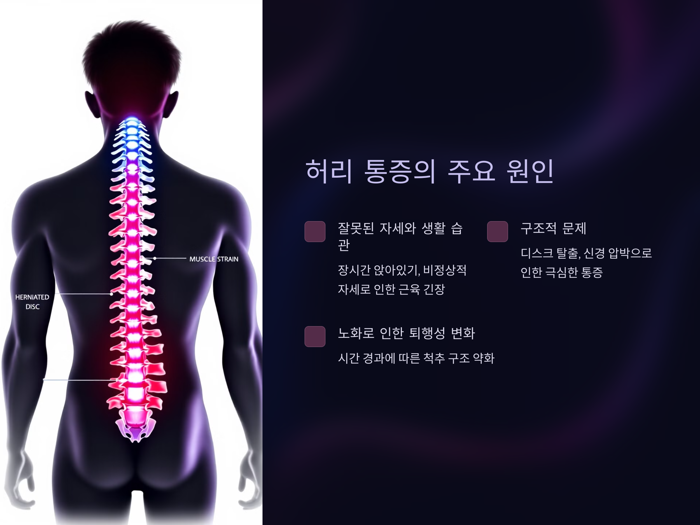 허리 통증의 주요 원인은 크게 세 가지로 나눌 수 있습니다. 첫째, 잘못된 자세와 생활 습관으로 인한 근육 긴장입니다. 장시간 앉아 있거나 비정상적인 자세를 유지하면 허리 근육이 긴장되어 통증이 발생합니다. 둘째, 디스크와 같은 구조적 문제입니다. 디스크가 밀려나거나 신경을 압박하면 극심한 통증이 유발됩니다. 셋째, 노화로 인한 퇴행성 변화입니다. 시간이 지남에 따라 척추 구조가 약화되고 통증이 발생하기 쉽습니다.