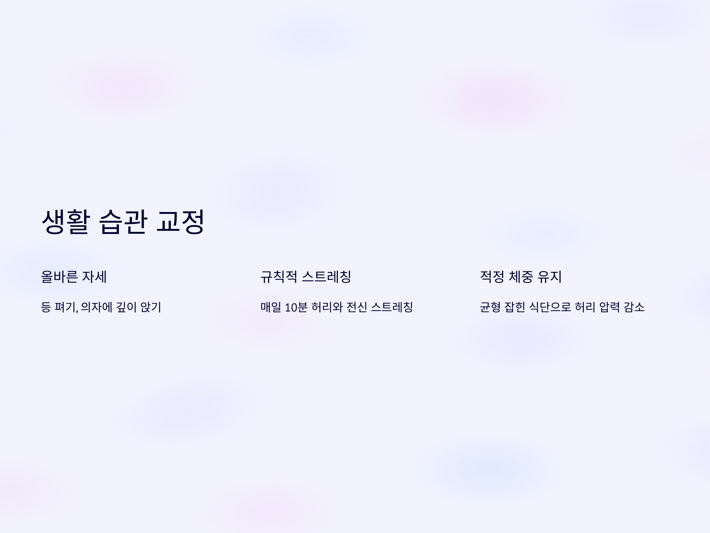 체중이 늘어나면 허리에 가해지는 압력이 커집니다. 균형 잡힌 식단과 적정 체중 유지는 허리 건강에 큰 도움이 됩니다.