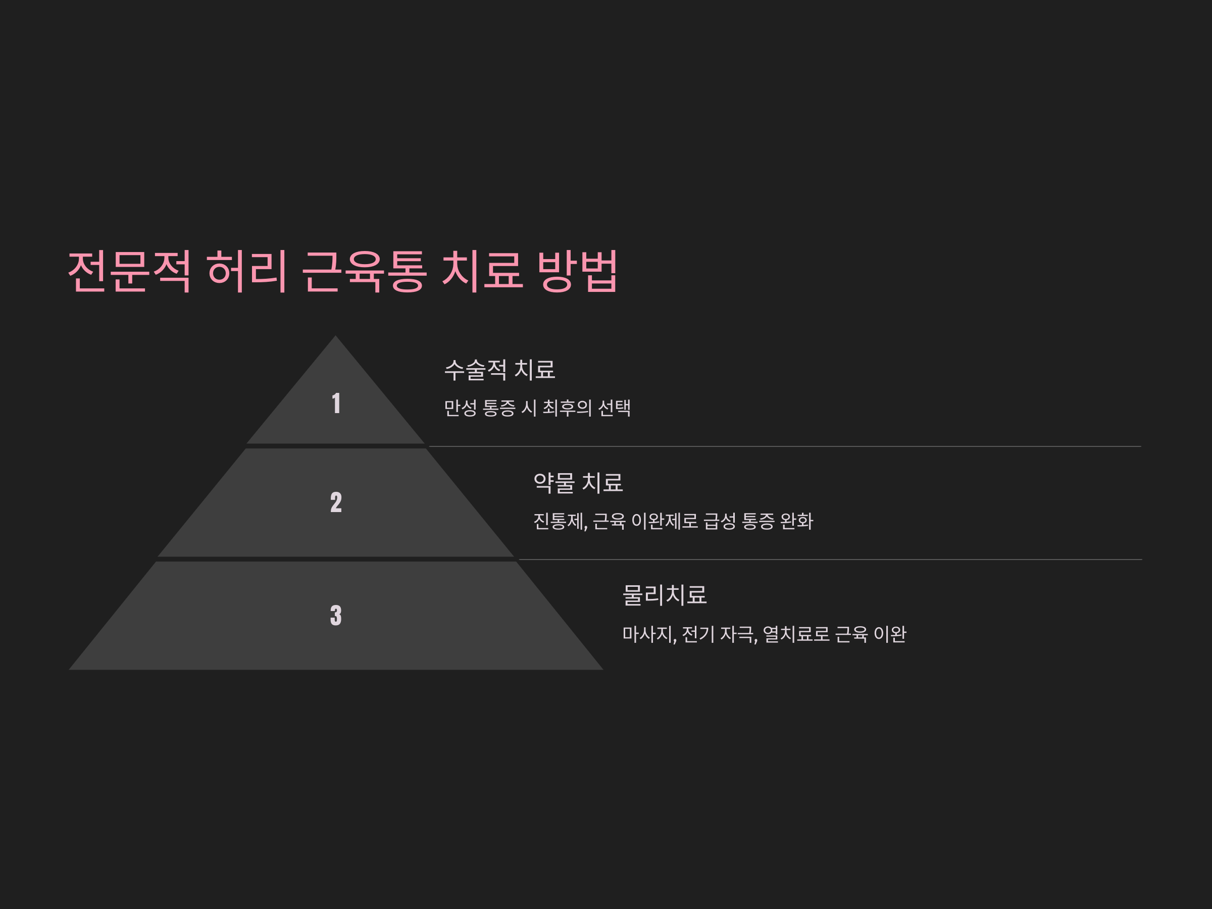 허리 근육통이 심해졌다면, 전문적인 치료가 필요할 수 있습니다. 의료기관에서의 치료 방법은 다음과 같습니다: