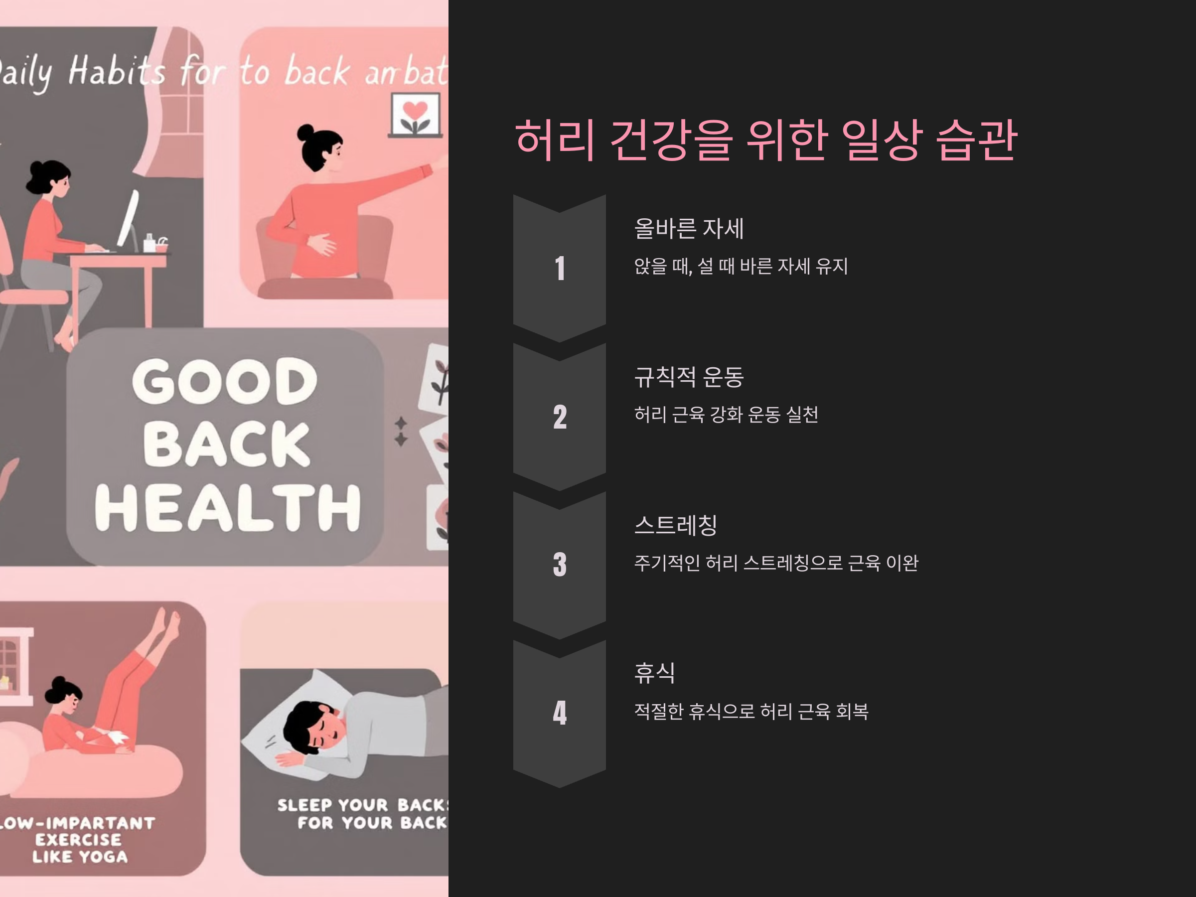 허리 근육을 강화하는 운동이 중요합니다. 수영, 요가, 필라테스 등이 허리와 복부 근육을 강화하는 데 효과적입니다.