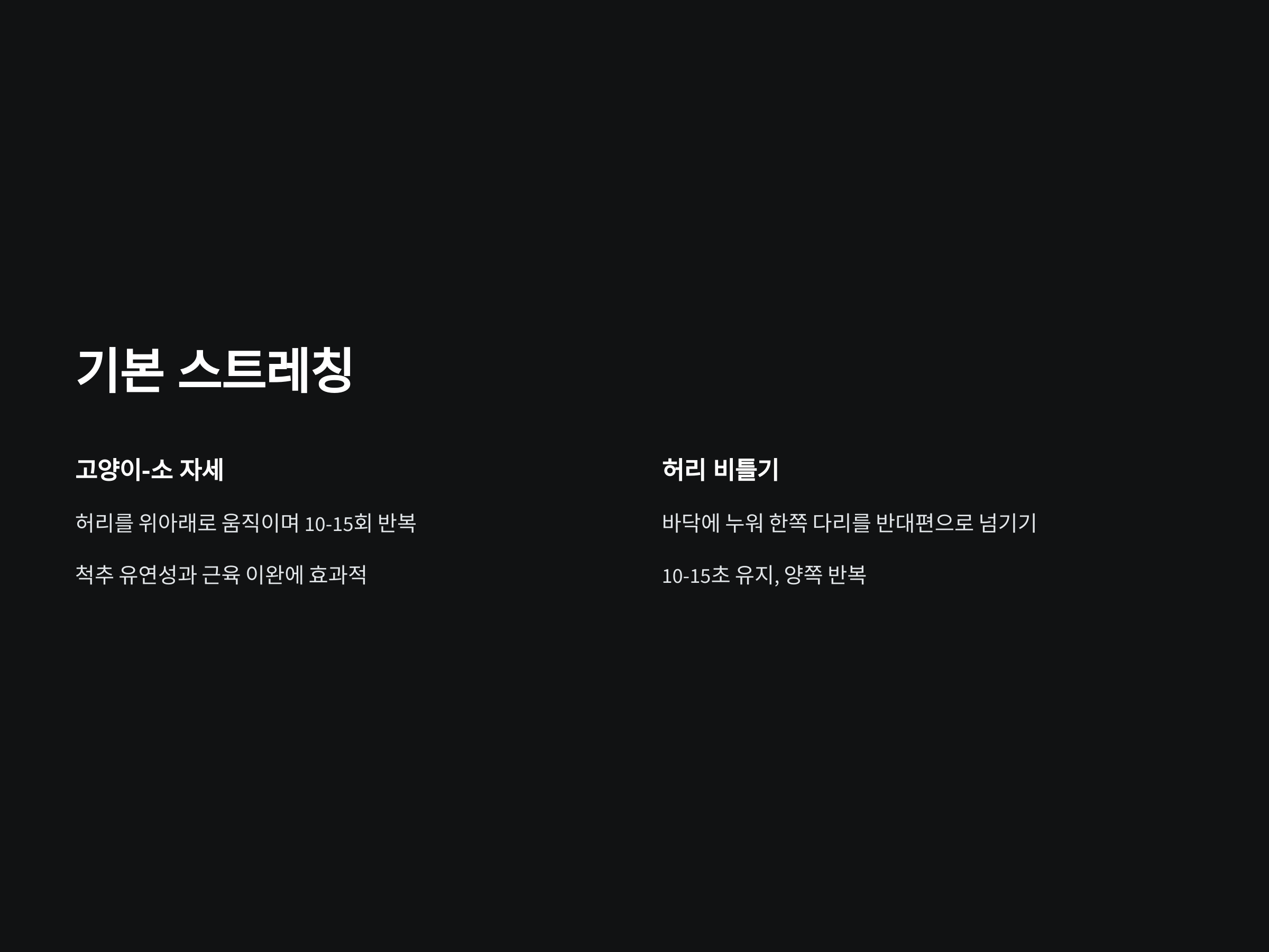 운동을 시작하기 전에 스트레칭으로 허리 근육을 이완하는 것이 중요합니다. 스트레칭은 허리 부상의 위험을 줄이고 운동 효과를 극대화할 수 있습니다.