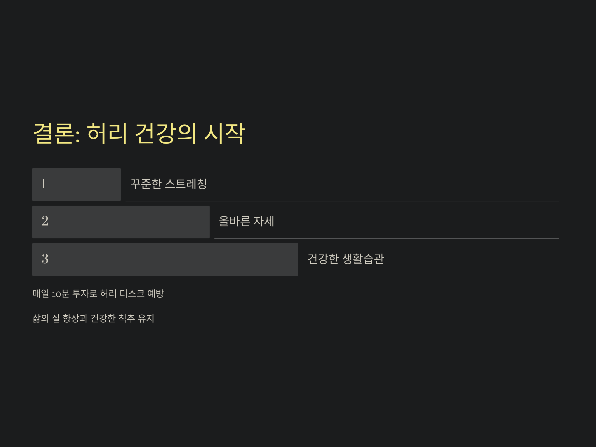 허리 디스크 예방은 꾸준한 스트레칭과 올바른 자세, 건강한 생활습관에서 시작됩니다. 오늘 소개한 스트레칭 루틴을 따라 하며 허리 건강을 지키고 삶의 질을 높여 보세요. 매일 10분 투자로 허리 디스크로부터 자유로워질 수 있습니다.