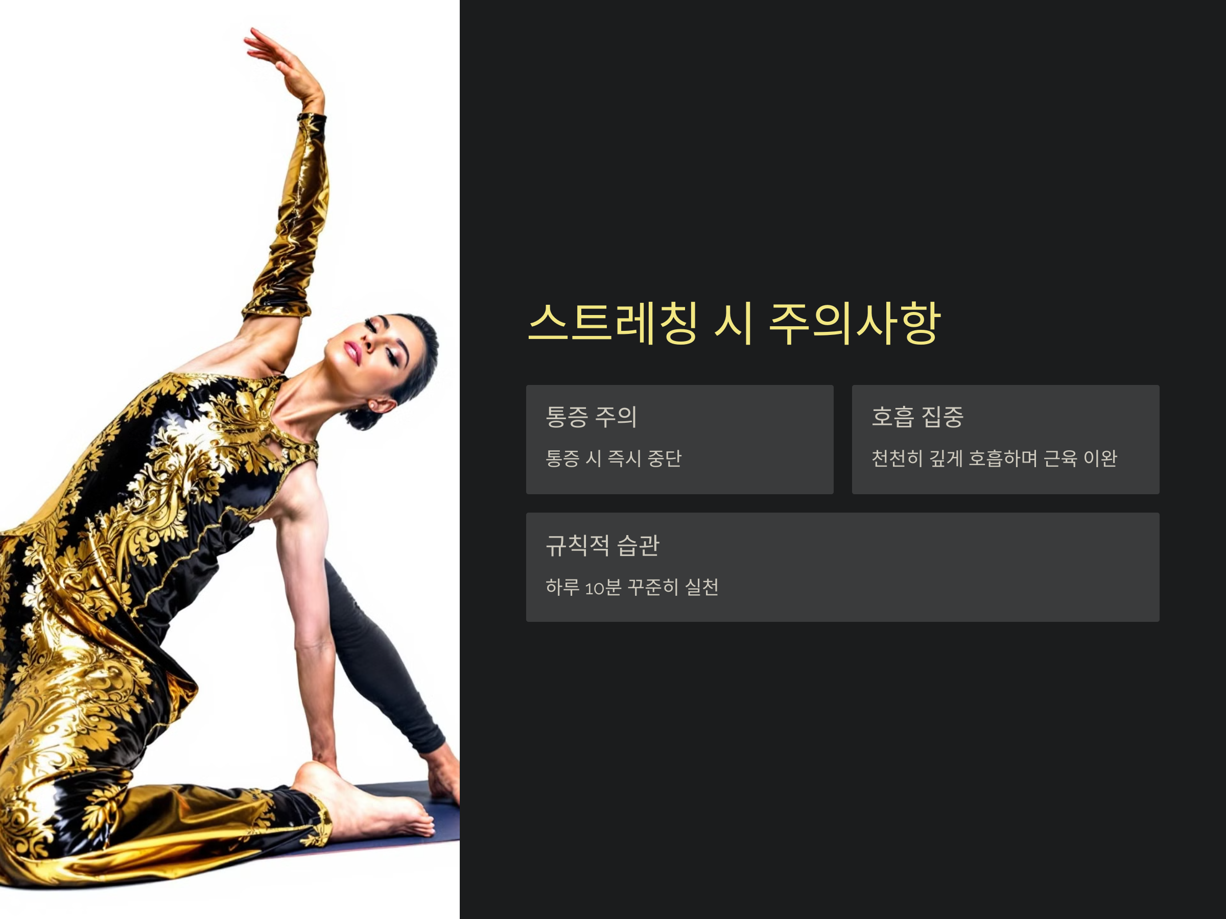 - 규칙적인 습관: 하루에 10분만이라도 꾸준히 스트레칭하는 것이 중요합니다.