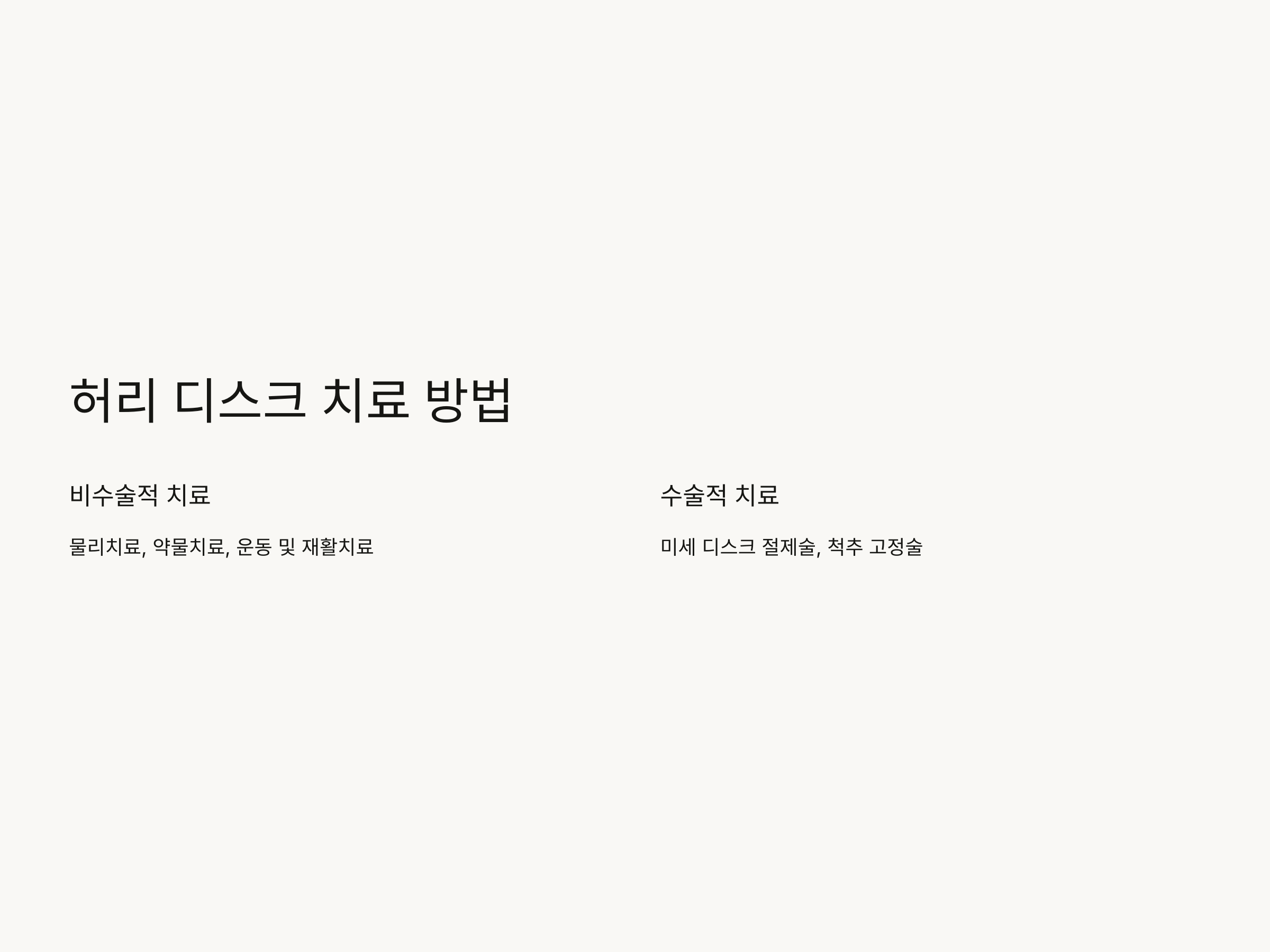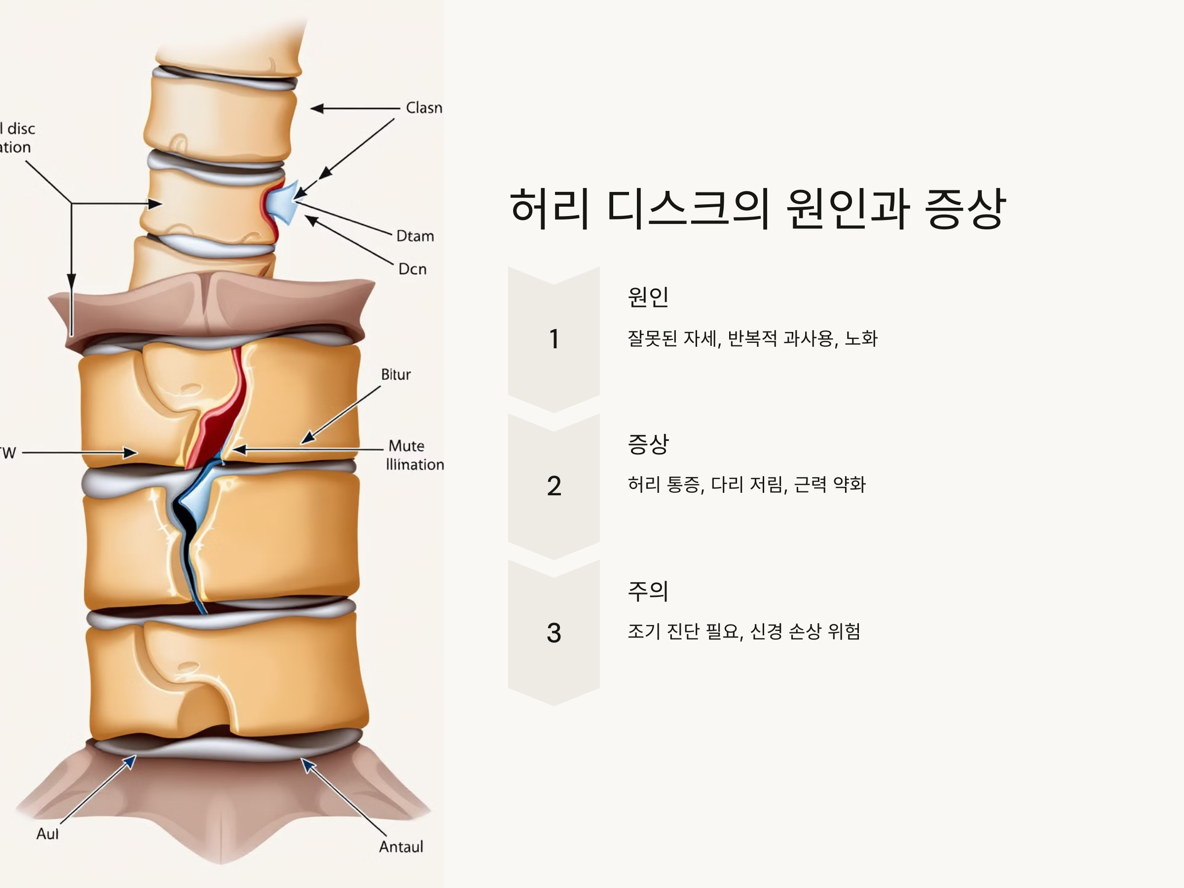 - 모든 증상이 디스크 때문은 아니므로 정확한 진단 필수.