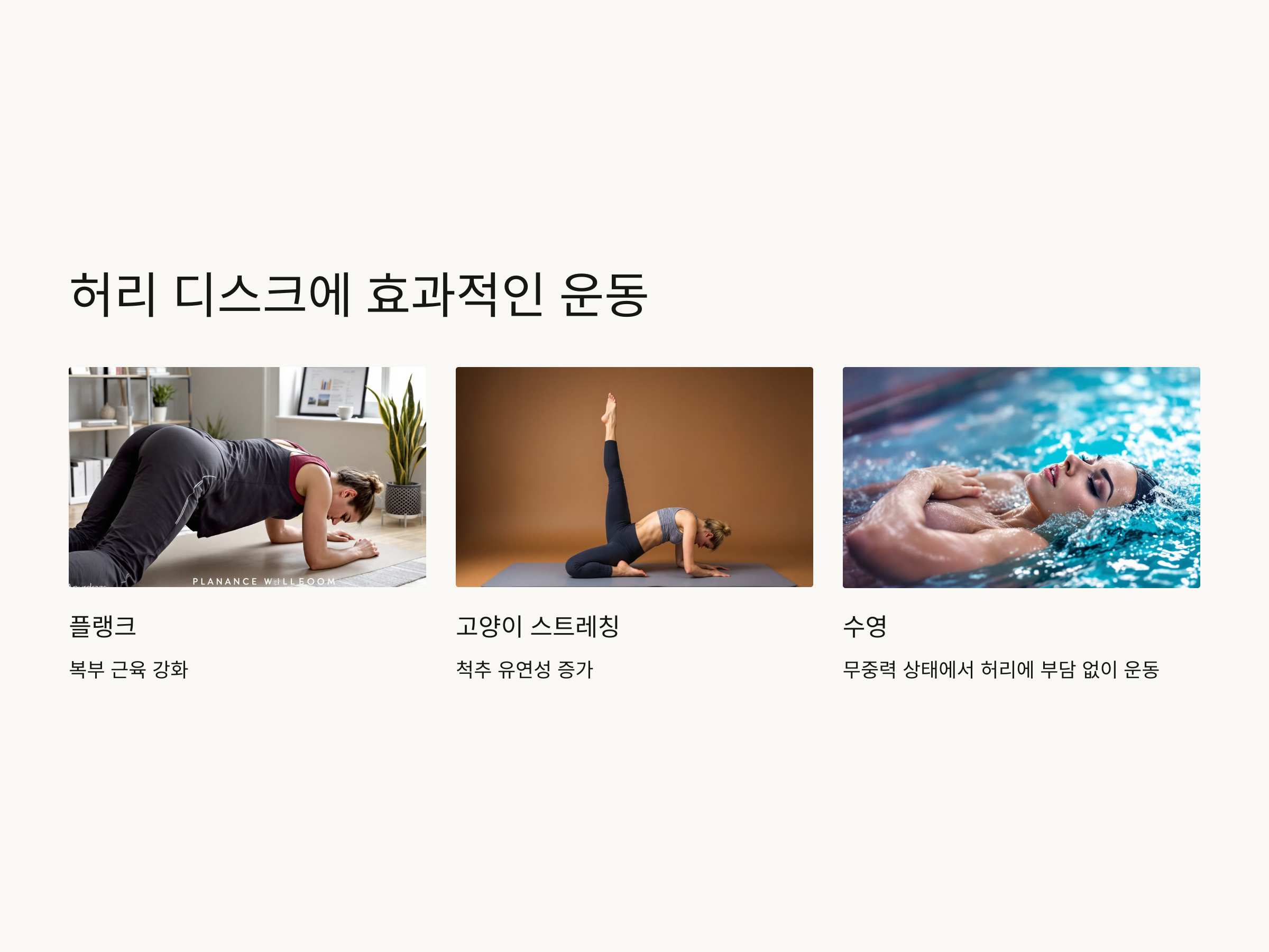 - 운동 습관: 걷기, 수영, 요가 등 허리에 무리를 주지 않는 운동.