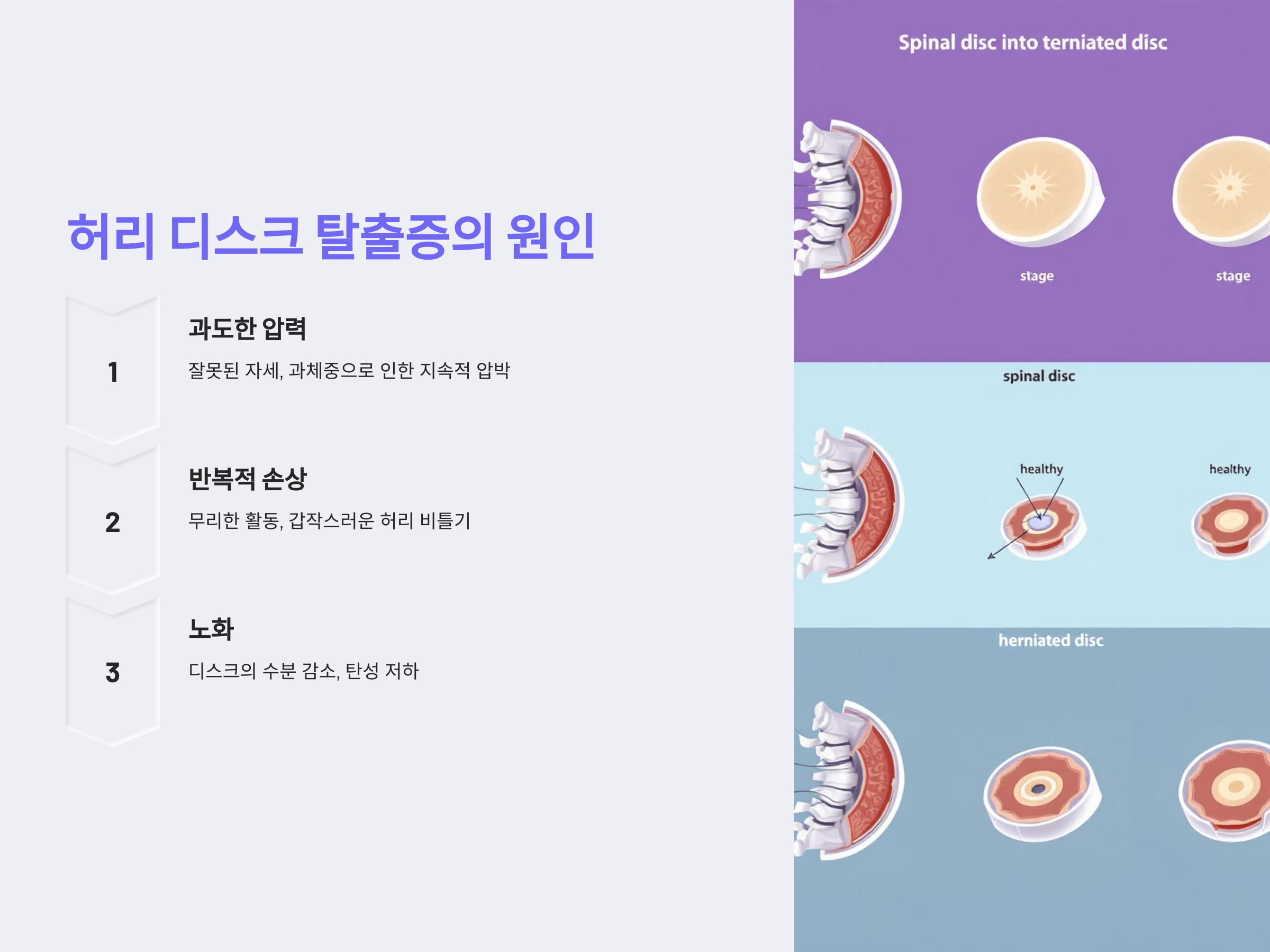 - 과도한 운동 또는 무리한 활동: 무거운 물건을 들거나 갑작스럽게 허리를 비트는 동작이 디스크에 손상을 줄 수 있습니다.