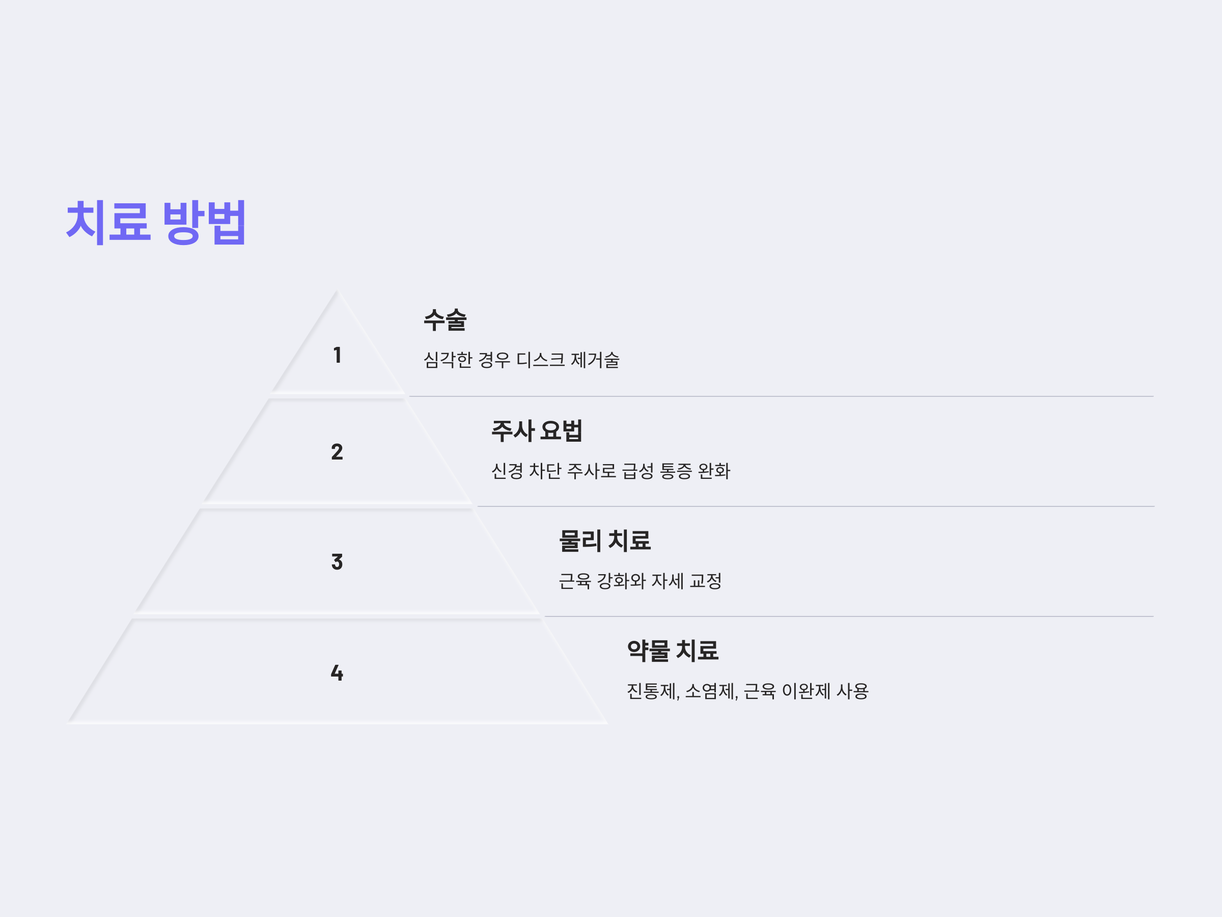- 약물 치료: 통증과 염증 완화를 위해 진통제, 소염제, 근육 이완제가 사용됩니다.