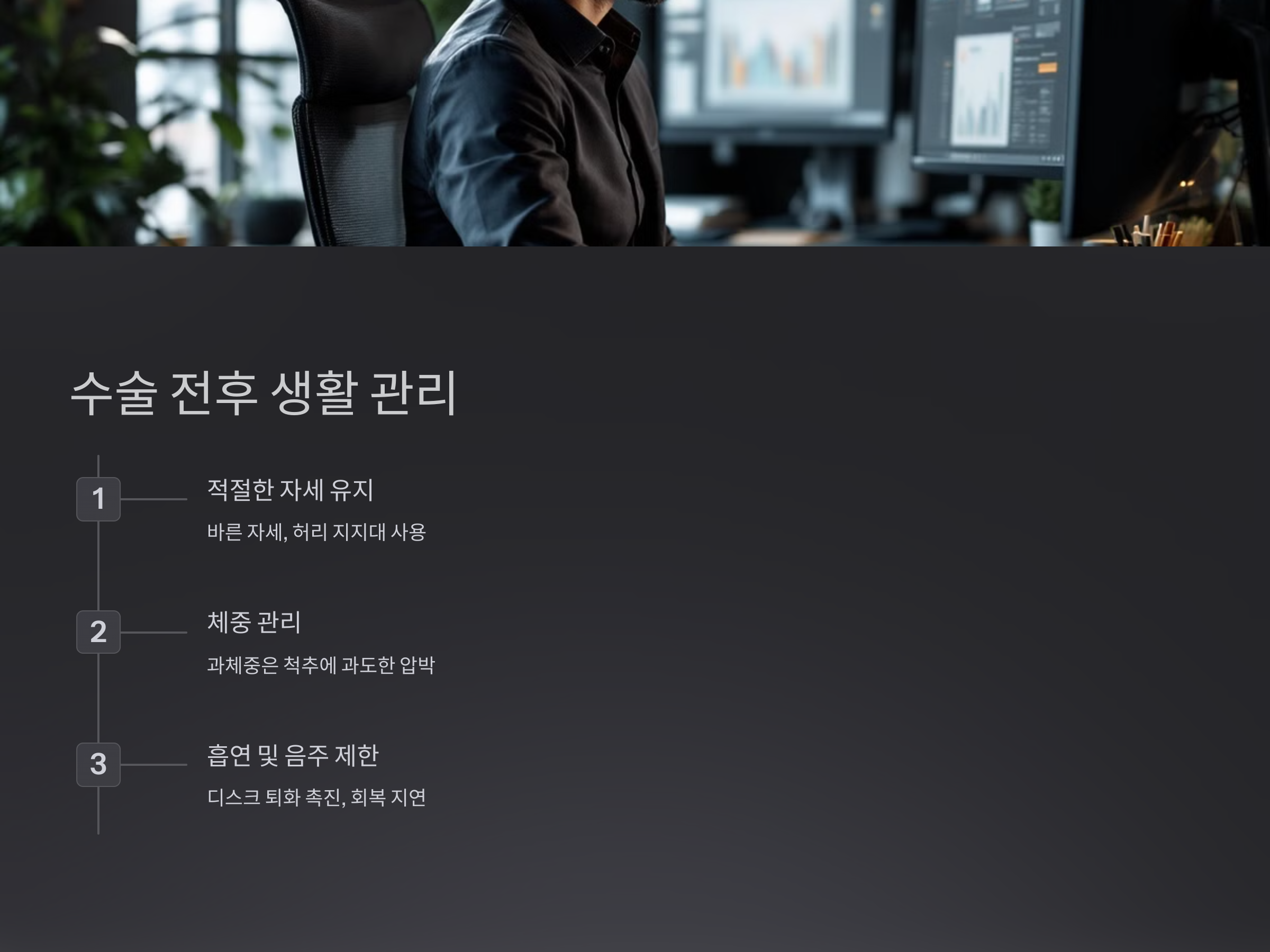 - 흡연 및 음주 제한: 흡연은 척추 디스크 퇴화를 촉진하고, 음주는 회복 과정을 늦출 수 있습니다.