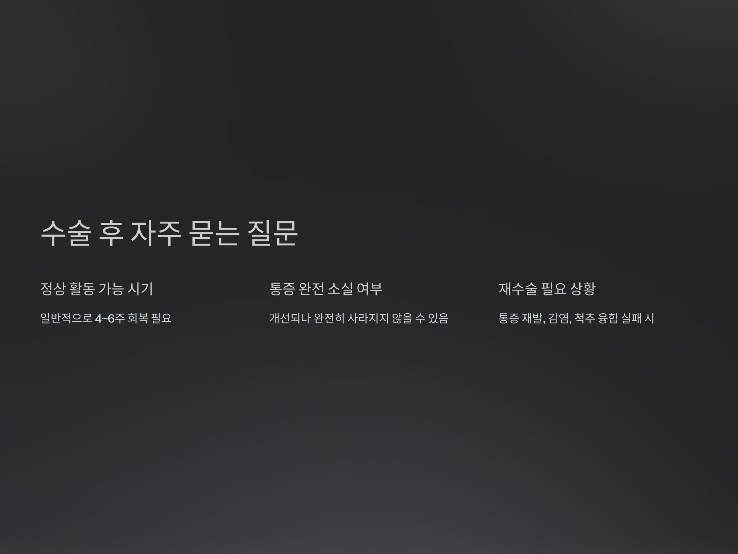 허리 수술 후 환자들이 가장 궁금해하는 질문들을 정리했습니다.