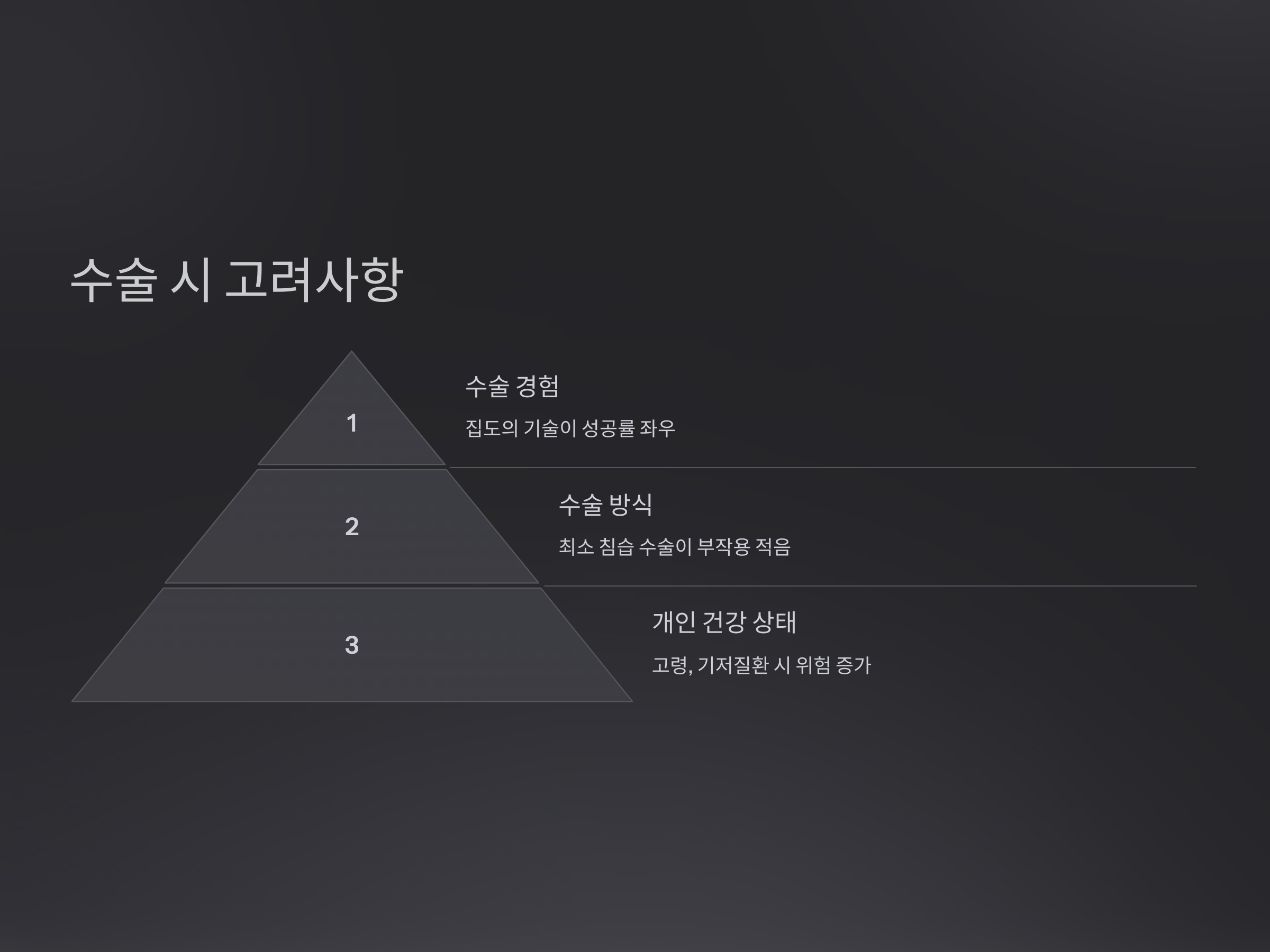 - 수술 방식: 최소 침습 수술은 회복 시간이 짧고 부작용이 적은 편입니다.
