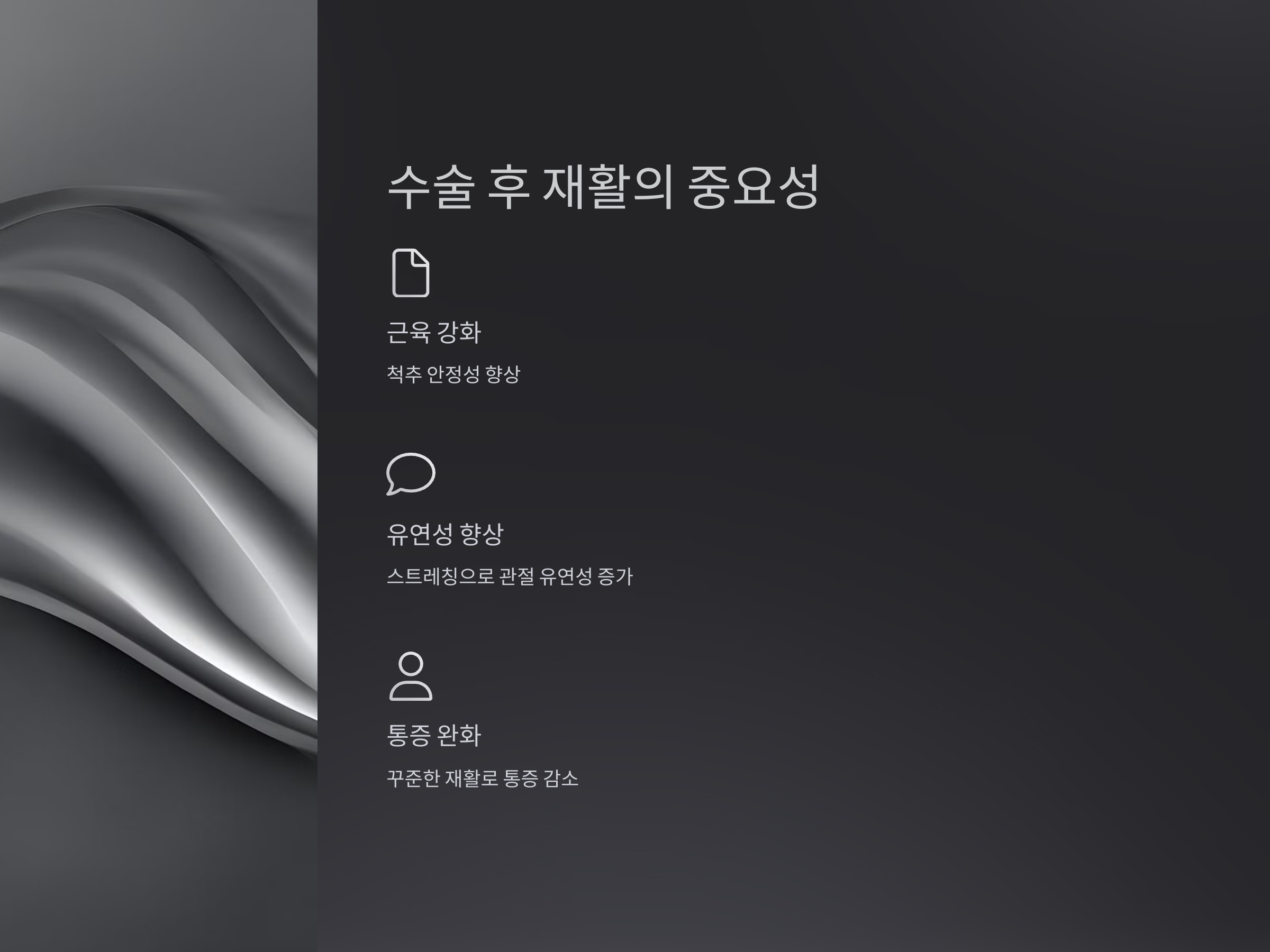 허리 수술 후 재활은 회복 속도와 부작용 최소화를 위해 필수적인 과정입니다. 올바른 재활 프로그램은 아래와 같은 장점을 제공합니다.