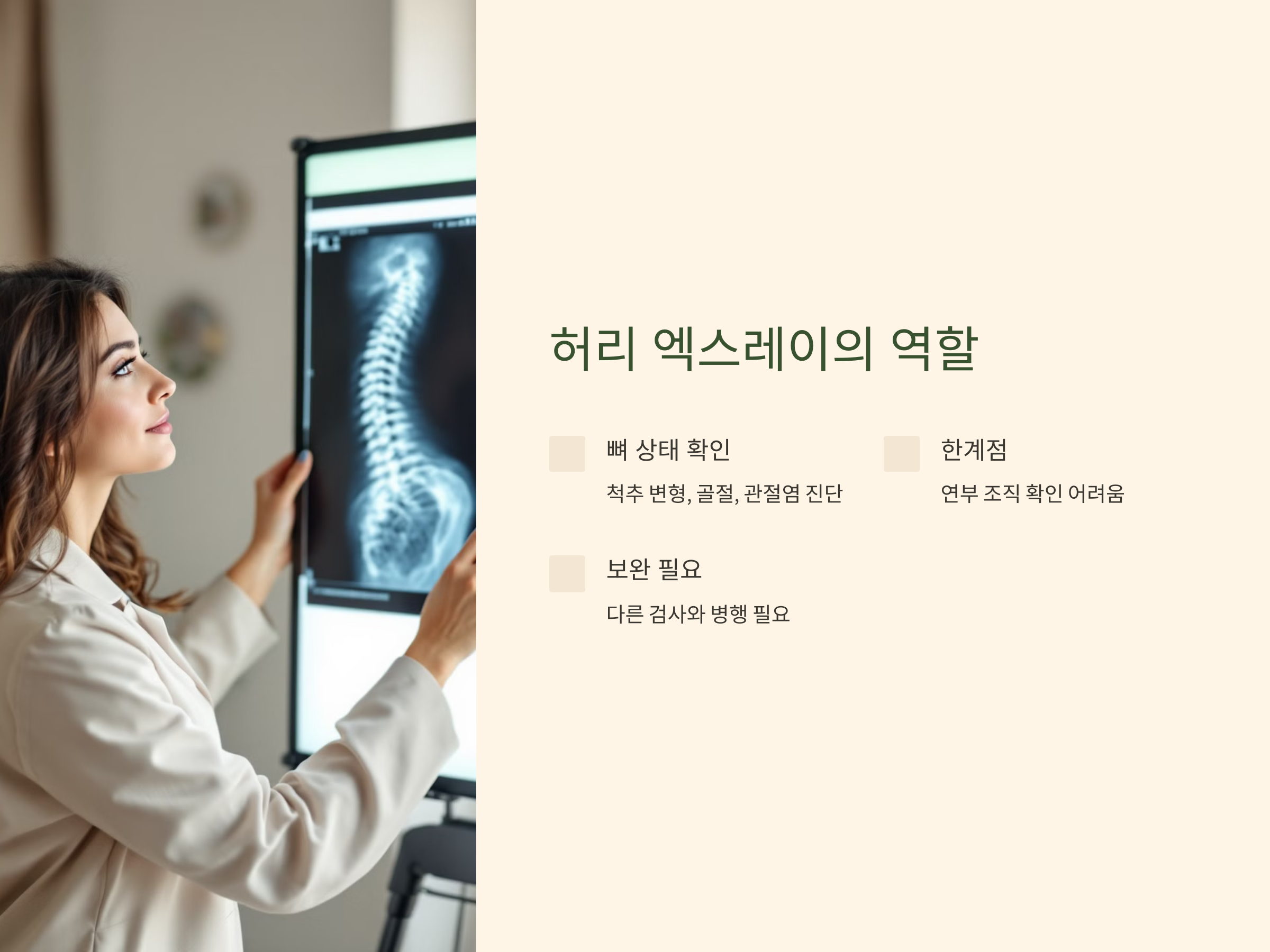 리 통증이 있다면 많은 사람들이 가장 먼저 엑스레이(X-ray) 촬영을 떠올립니다. 하지만 엑스레이는 단순히 뼈 상태를 확인하는 검사에 불과하며, 정확한 진단을 위해서는 상황에 맞는 검사가 필요합니다. 이 글에서는 허리 엑스레이의 역할과 한계를 알아보고, 건강한 허리를 유지하기 위해 엑스레이를 어떻게 활용해야 하는지 알려드립니다. 또한 최신 정보를 기반으로 진단 기술의 발전과 주의할 점에 대해 상세히 다룹니다.