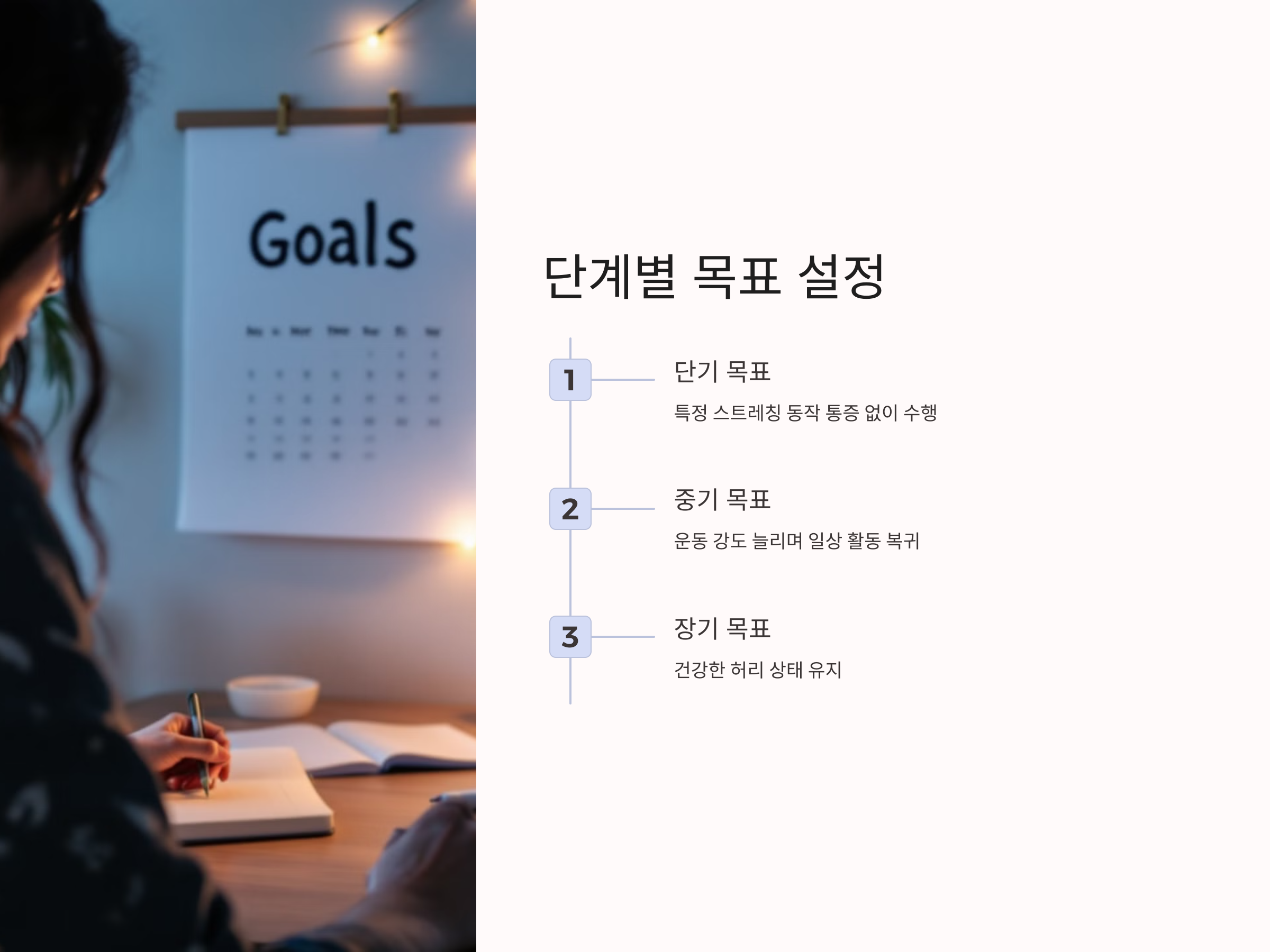 - 단기 목표: 예를 들어, 특정 스트레칭 동작을 통증 없이 수행하기.