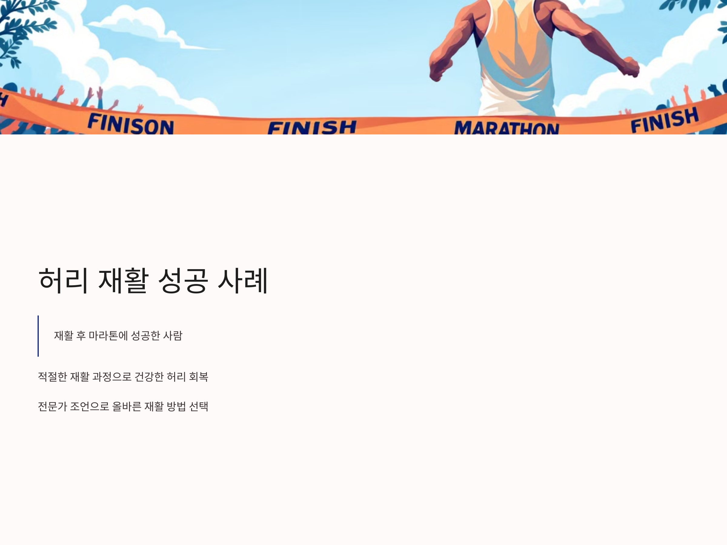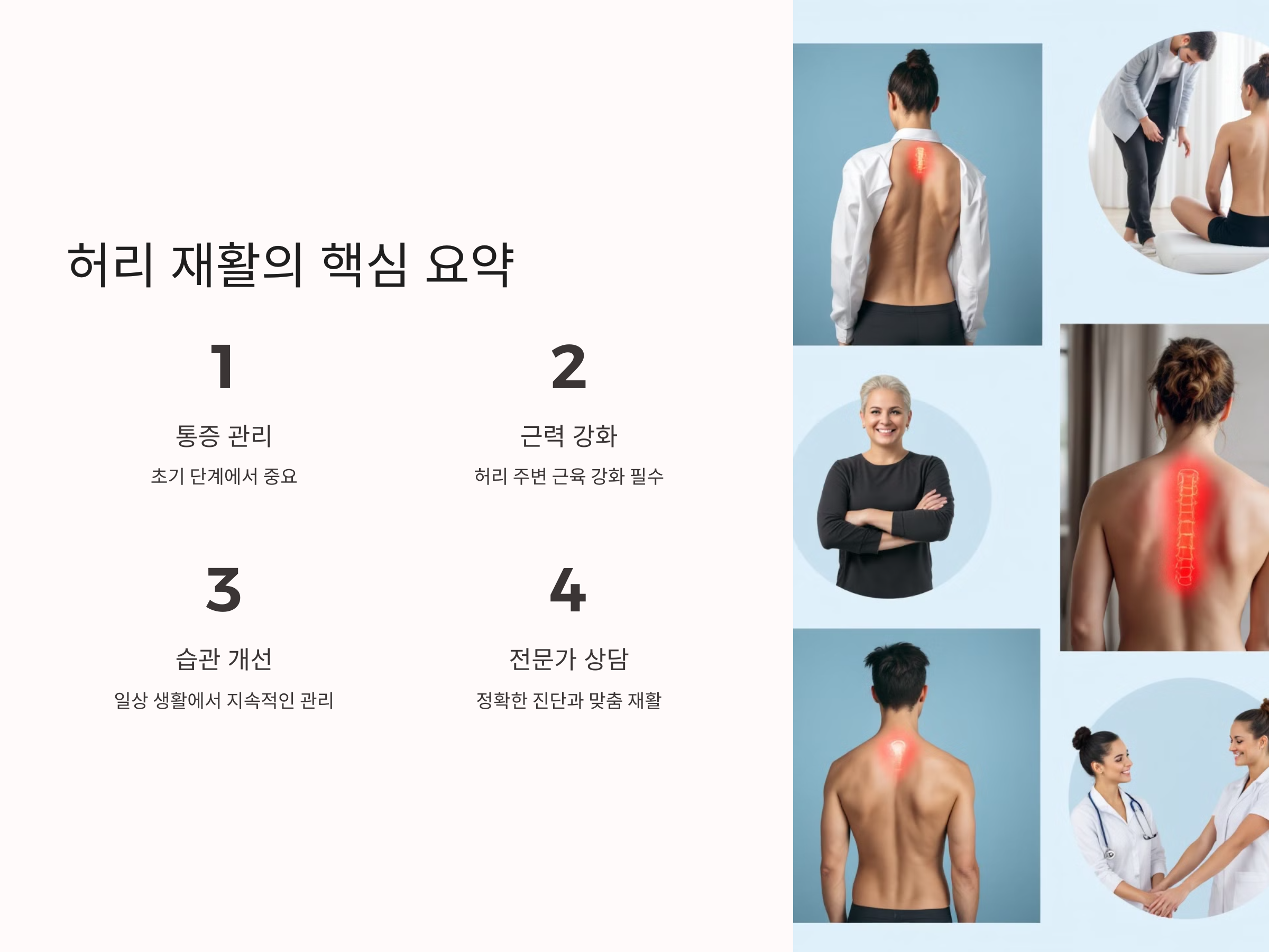 통증이 완화된 이후에는 허리 주변의 근육을 강화하는 것이 재활의 핵심입니다. 근력은 허리의 안정성을 높이고, 재발을 방지하는 데 중요한 역할을 합니다.