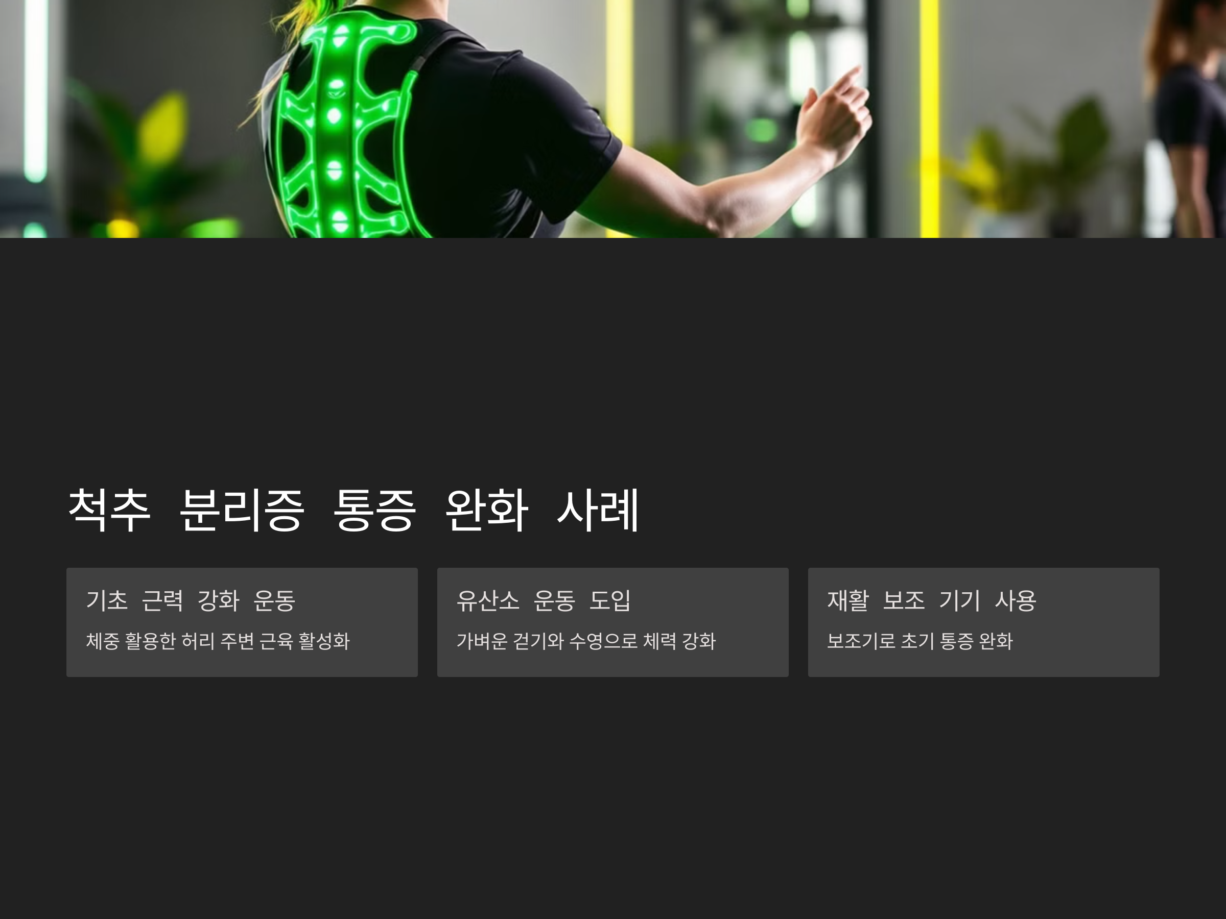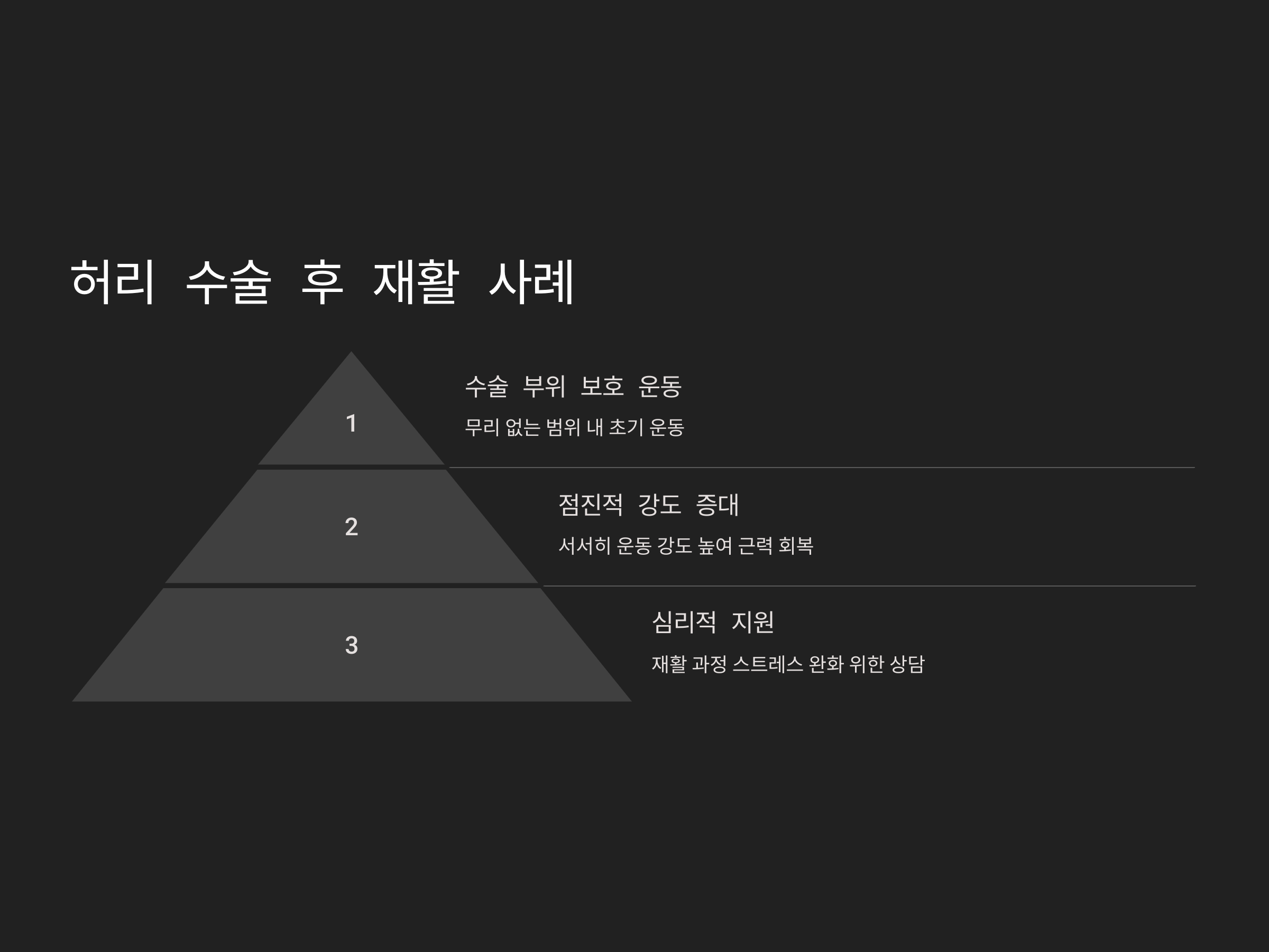 - 점진적 운동 재활: 허리 근력을 회복하기 위해 단계별로 운동 강도를 조절했습니다.