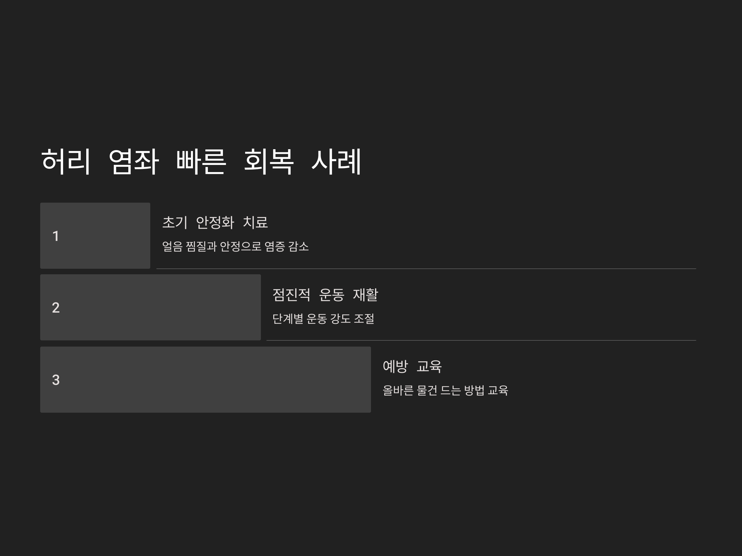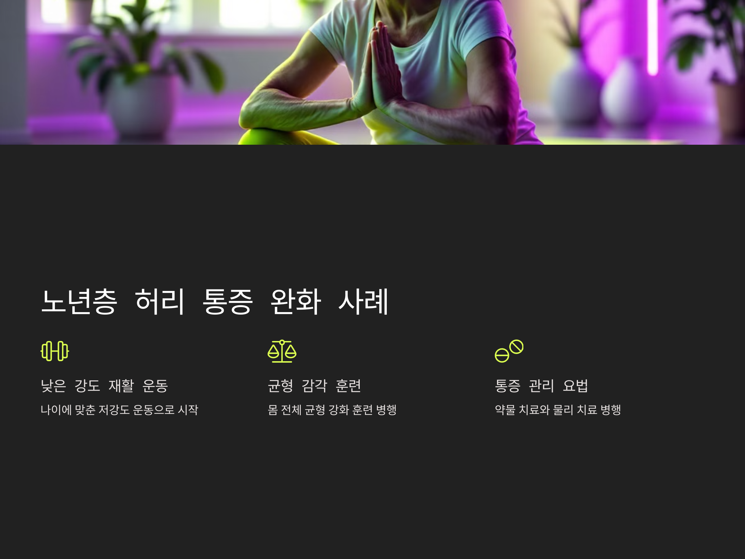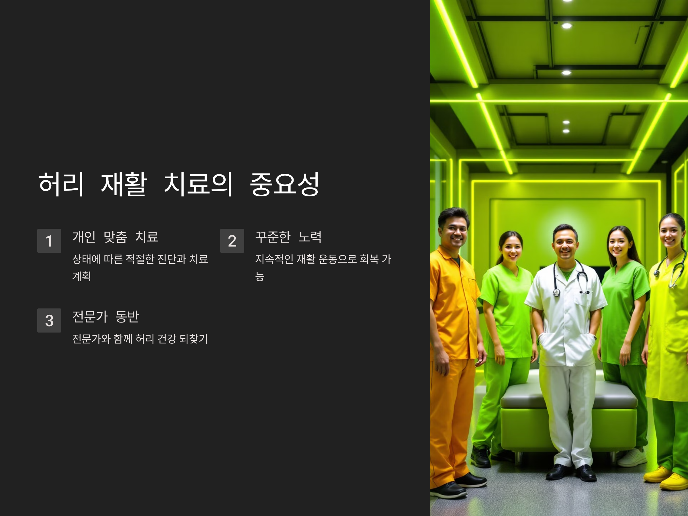 허리 재활 치료는 개인의 상태에 맞춰 진행되는 것이 중요합니다. 각 사례는 적절한 진단과 치료 계획, 꾸준한 노력의 결과로 회복이 가능하다는 점을 보여줍니다. 전문가와 함께라면 허리 건강을 되찾을 수 있습니다.