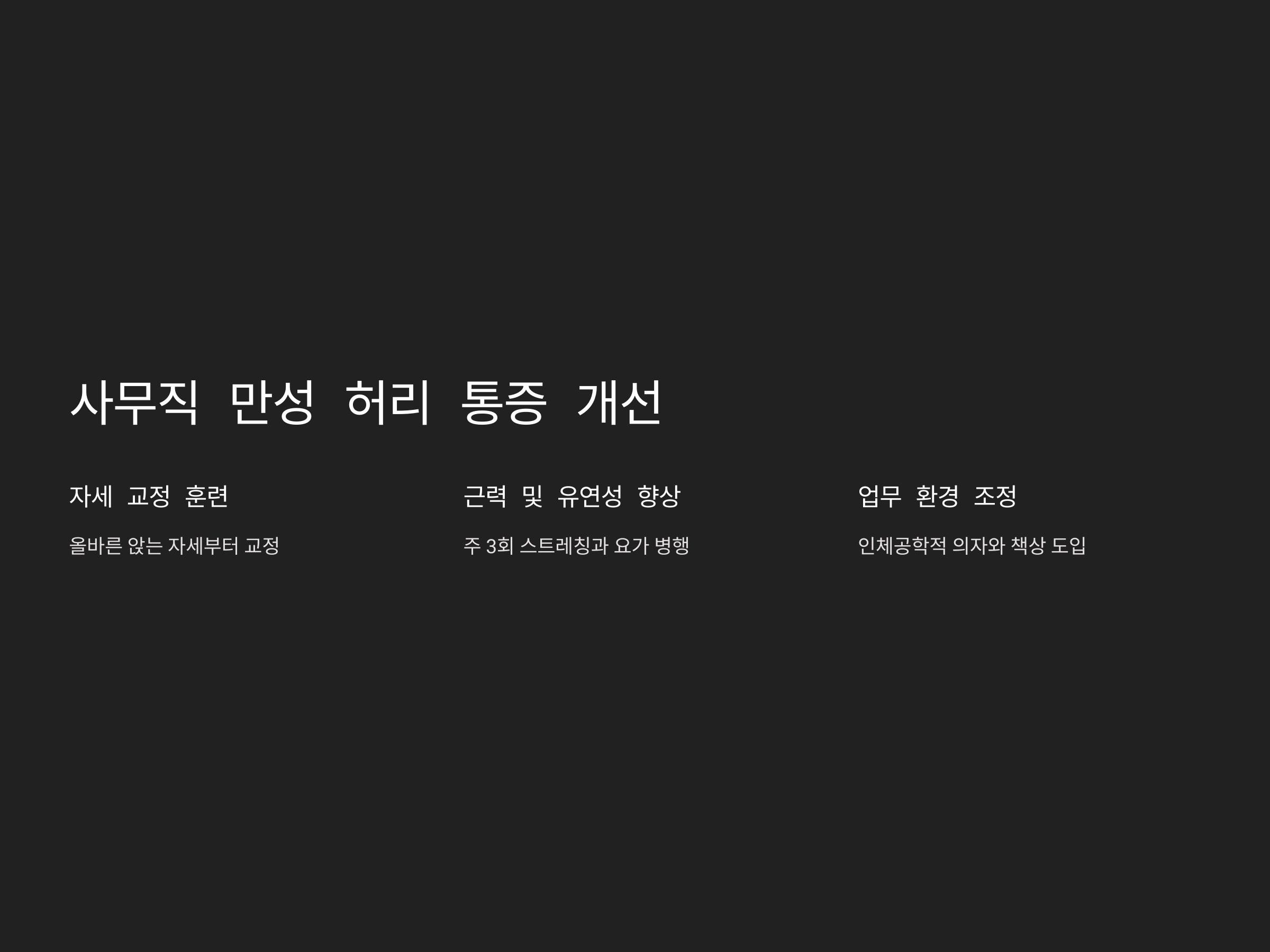 - 근력 및 유연성 향상 운동: 주 3회 꾸준히 스트레칭과 요가를 병행하며 개선했습니다.