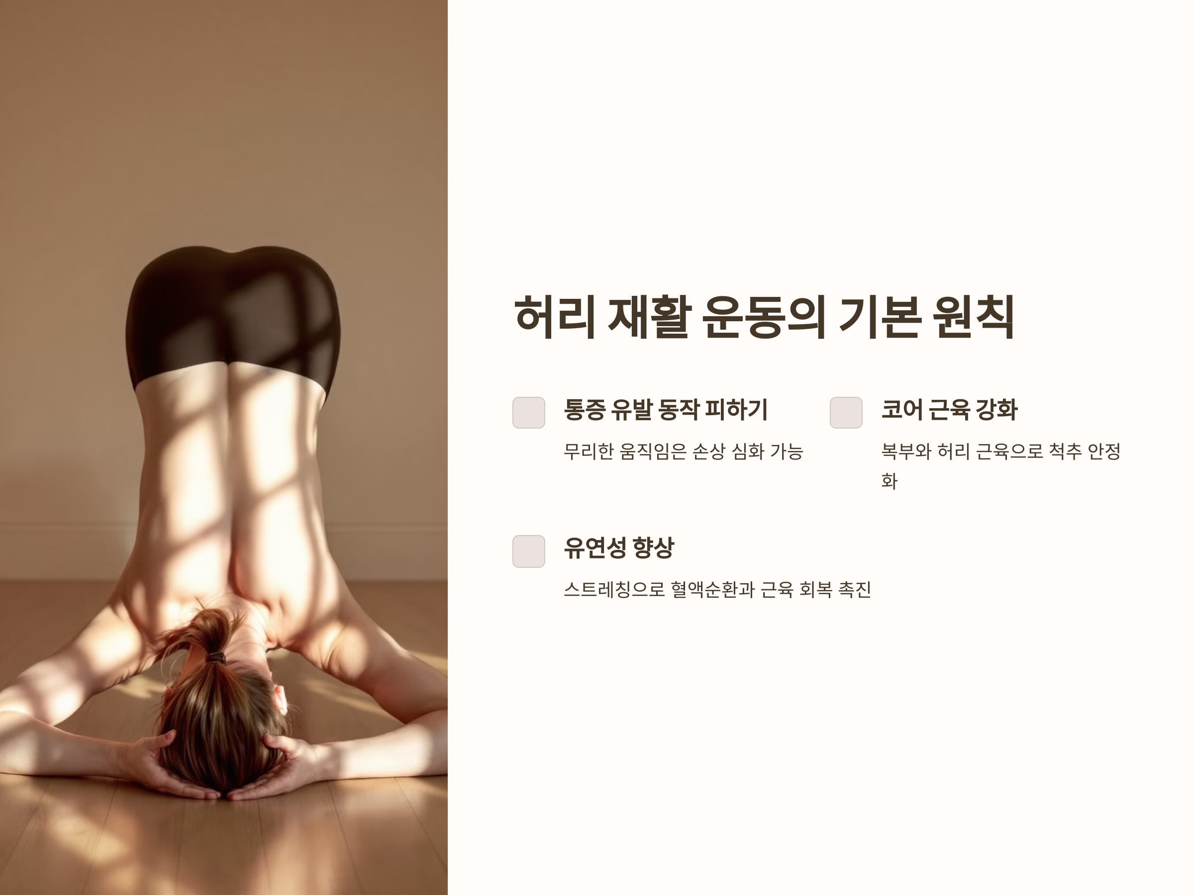 허리 재활 프로그램은 부상 부위를 악화시키지 않으면서 점진적으로 허리의 안정성과 유연성을 회복시키는 데 중점을 둡니다. 다음은 기본 원칙입니다.